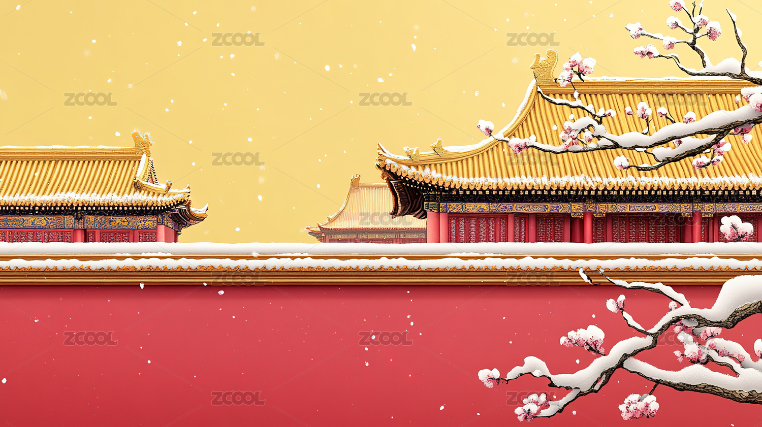 红色古建筑宫殿墙壁柿子树下雪雪景插画背景