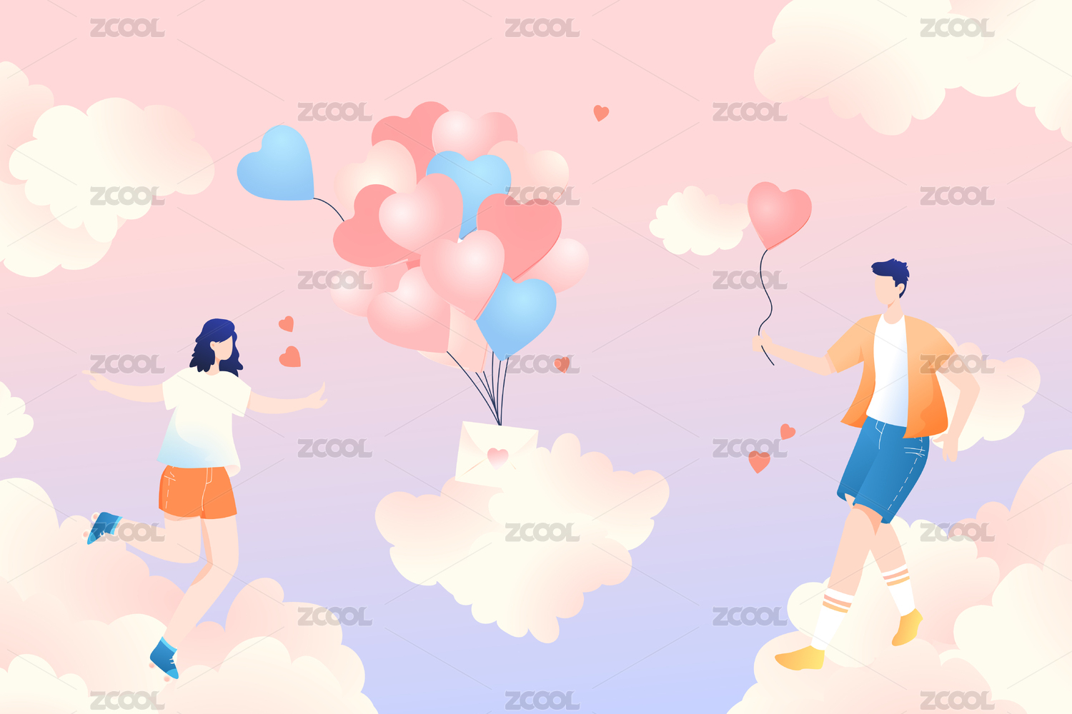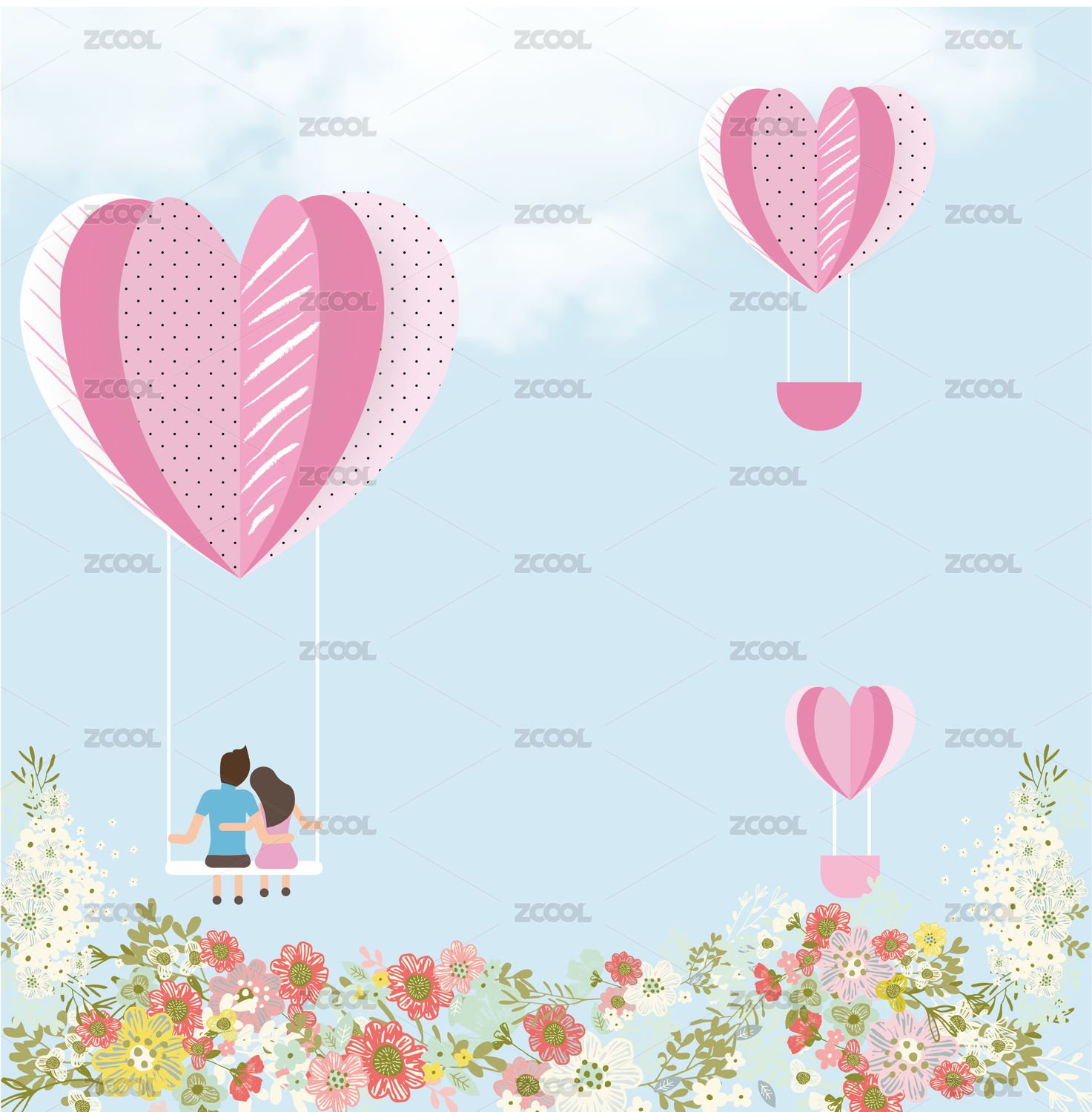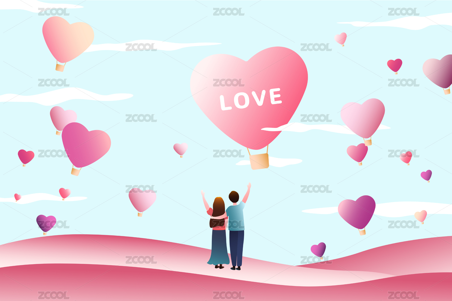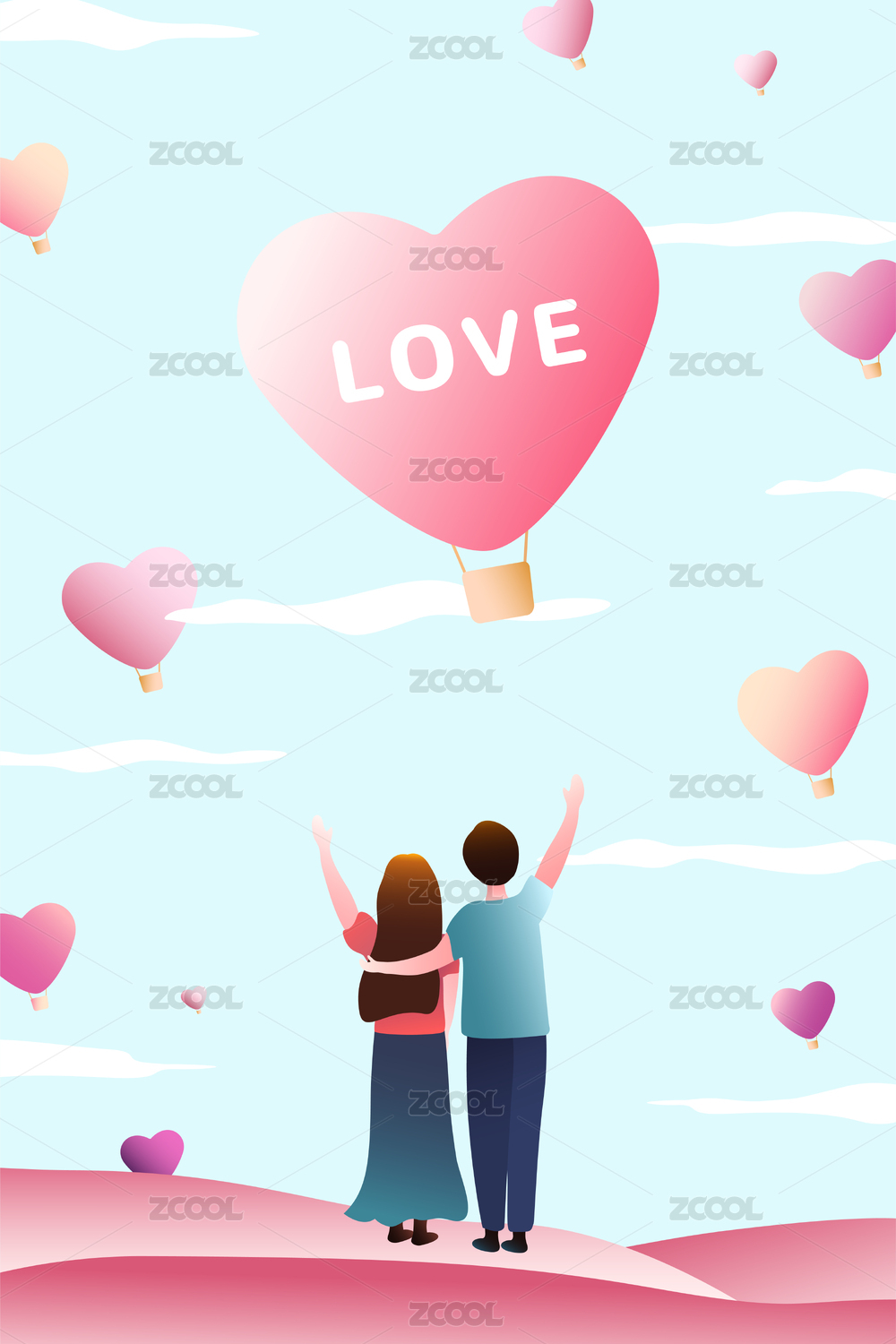 情人节七夕520爱情插画情侣爱心热气球