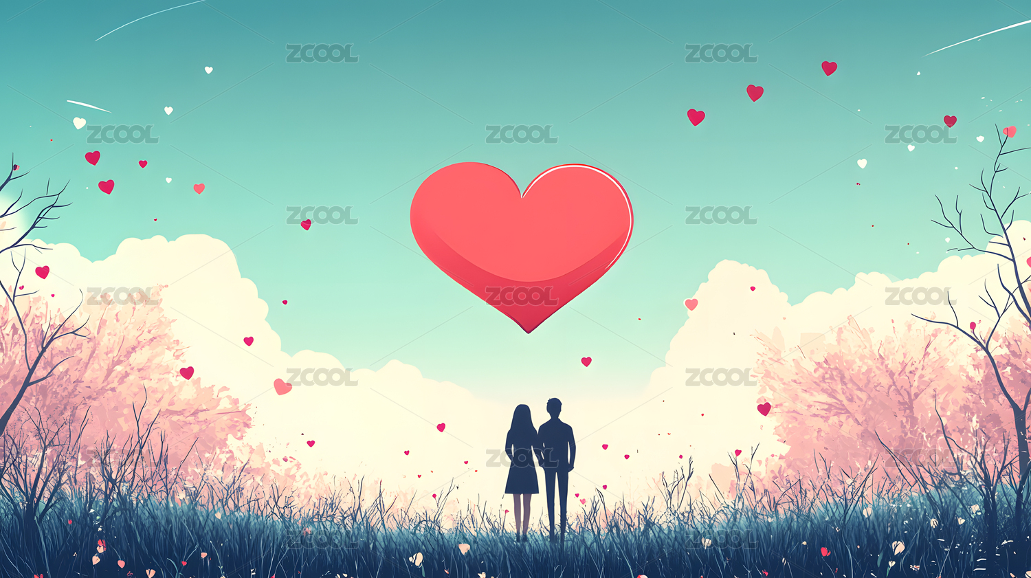 打伞的情侣和粉色玫瑰花爱心背景