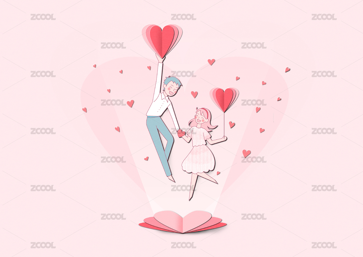 情侣在爱心礼盒里跳舞爱心背景抽象插画