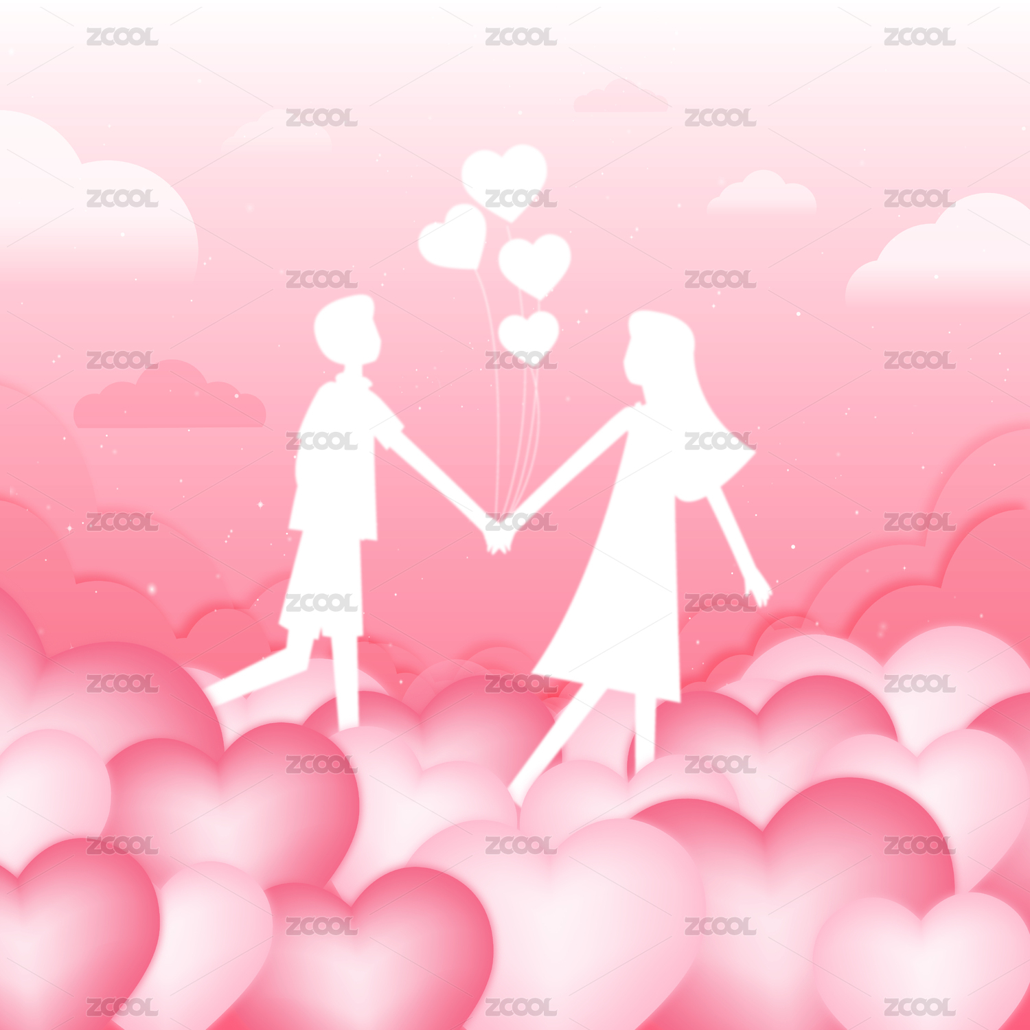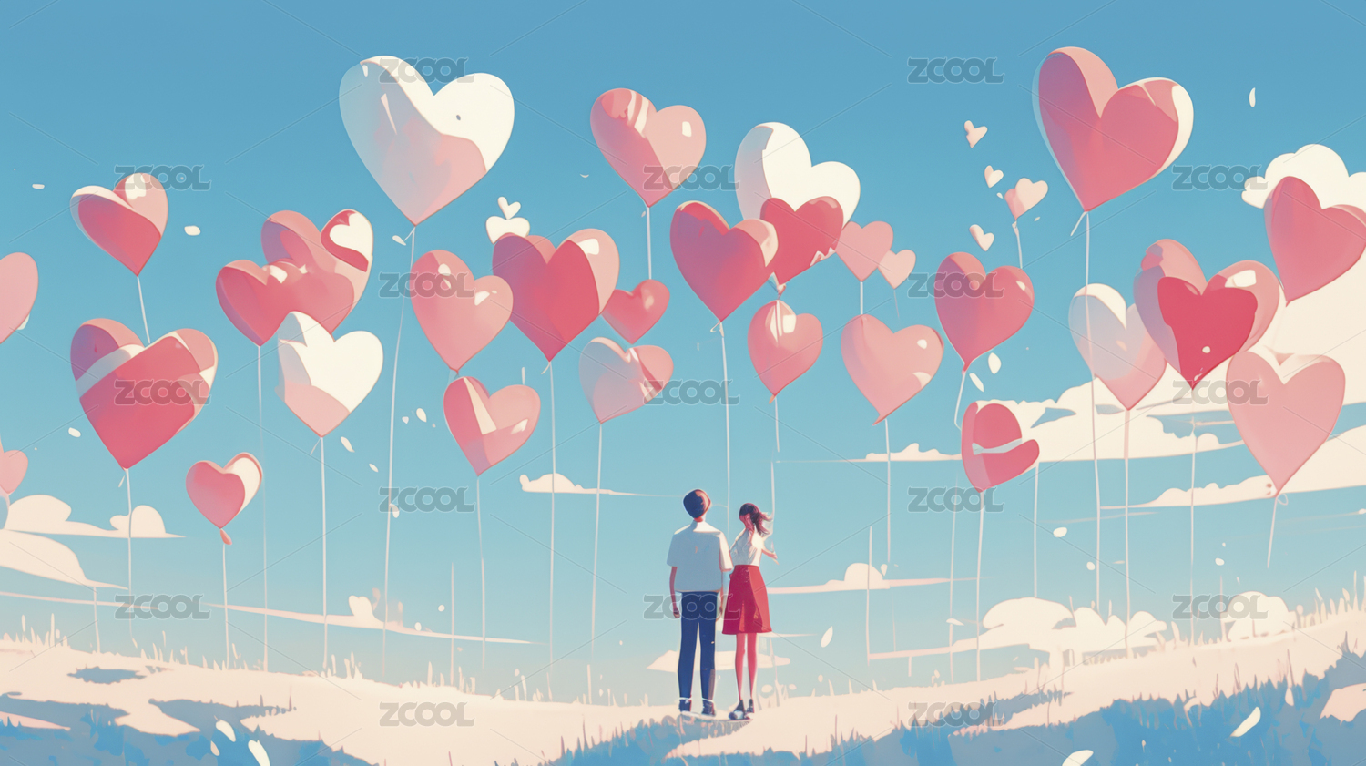 情侣漫步心形气球天空浪漫氛围