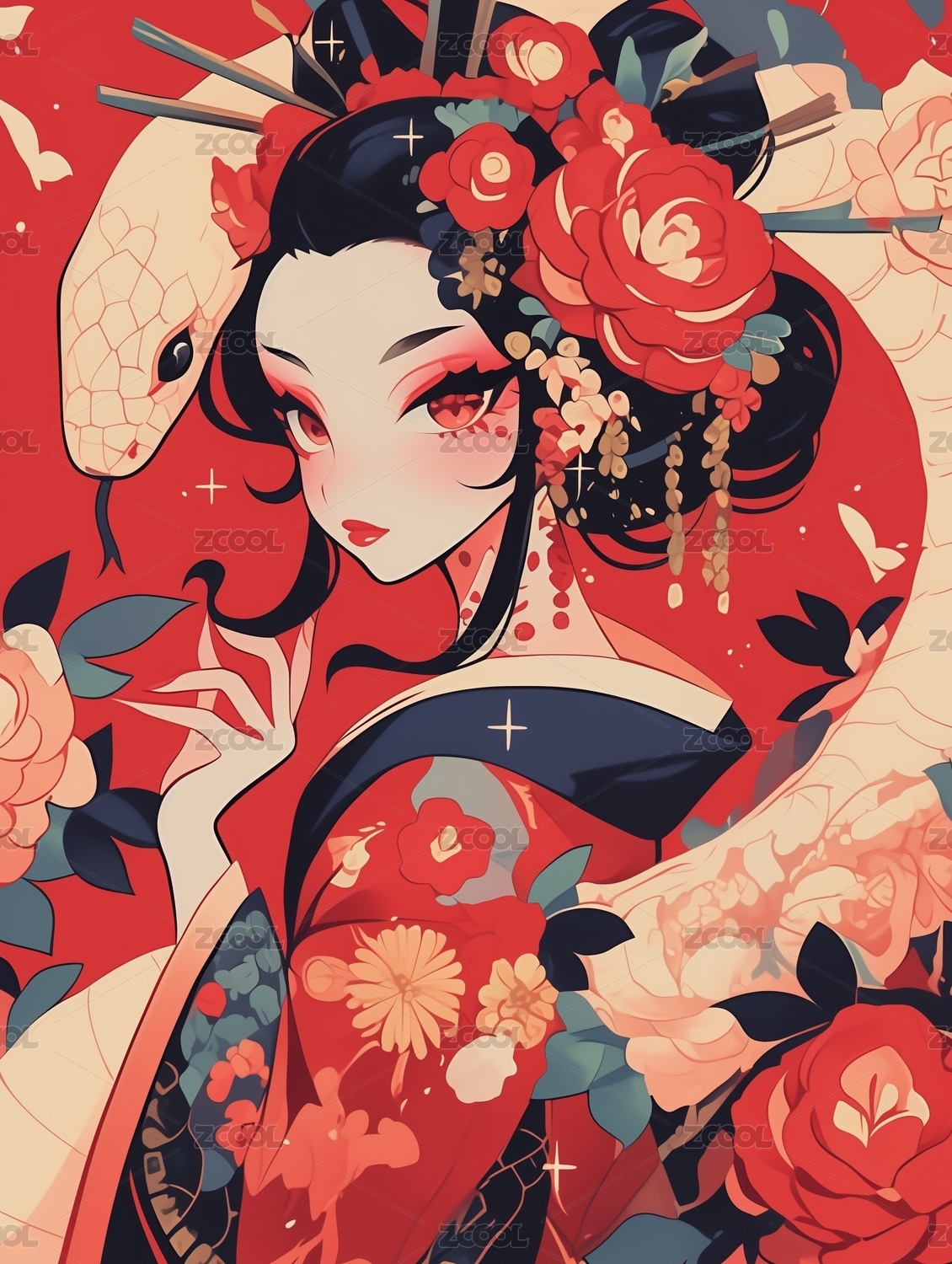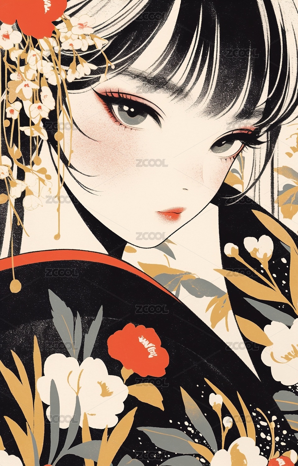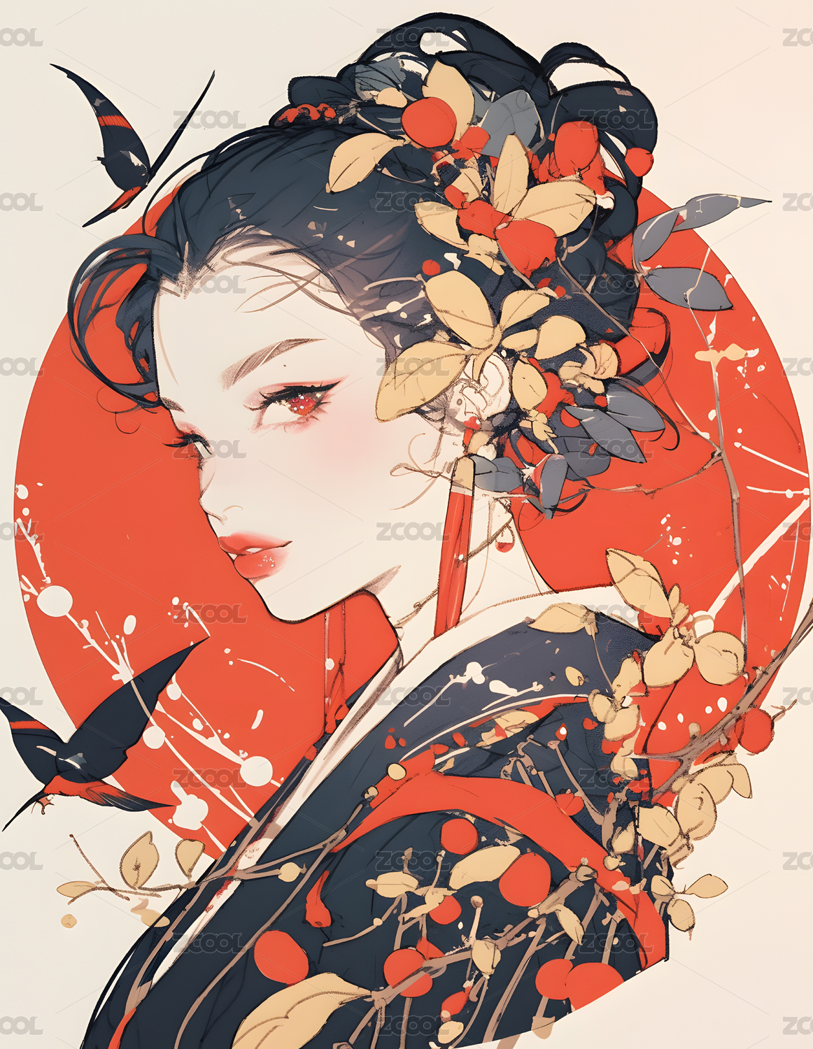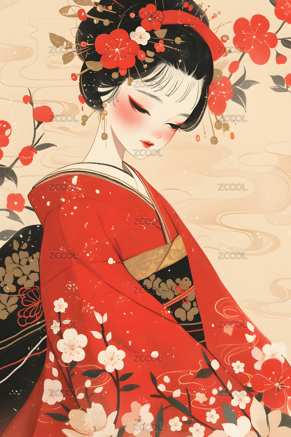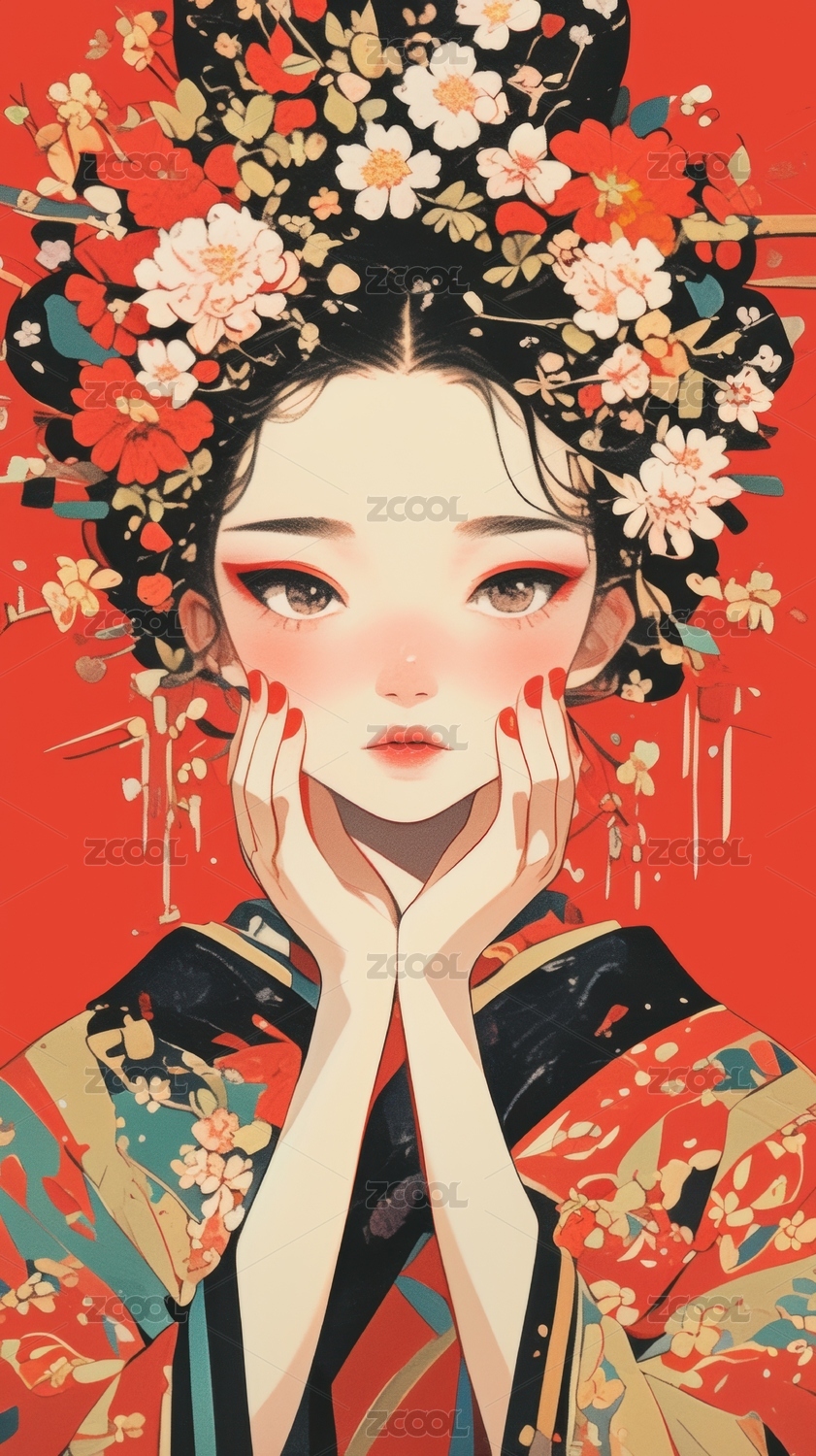 日式浮世绘红色和服美女