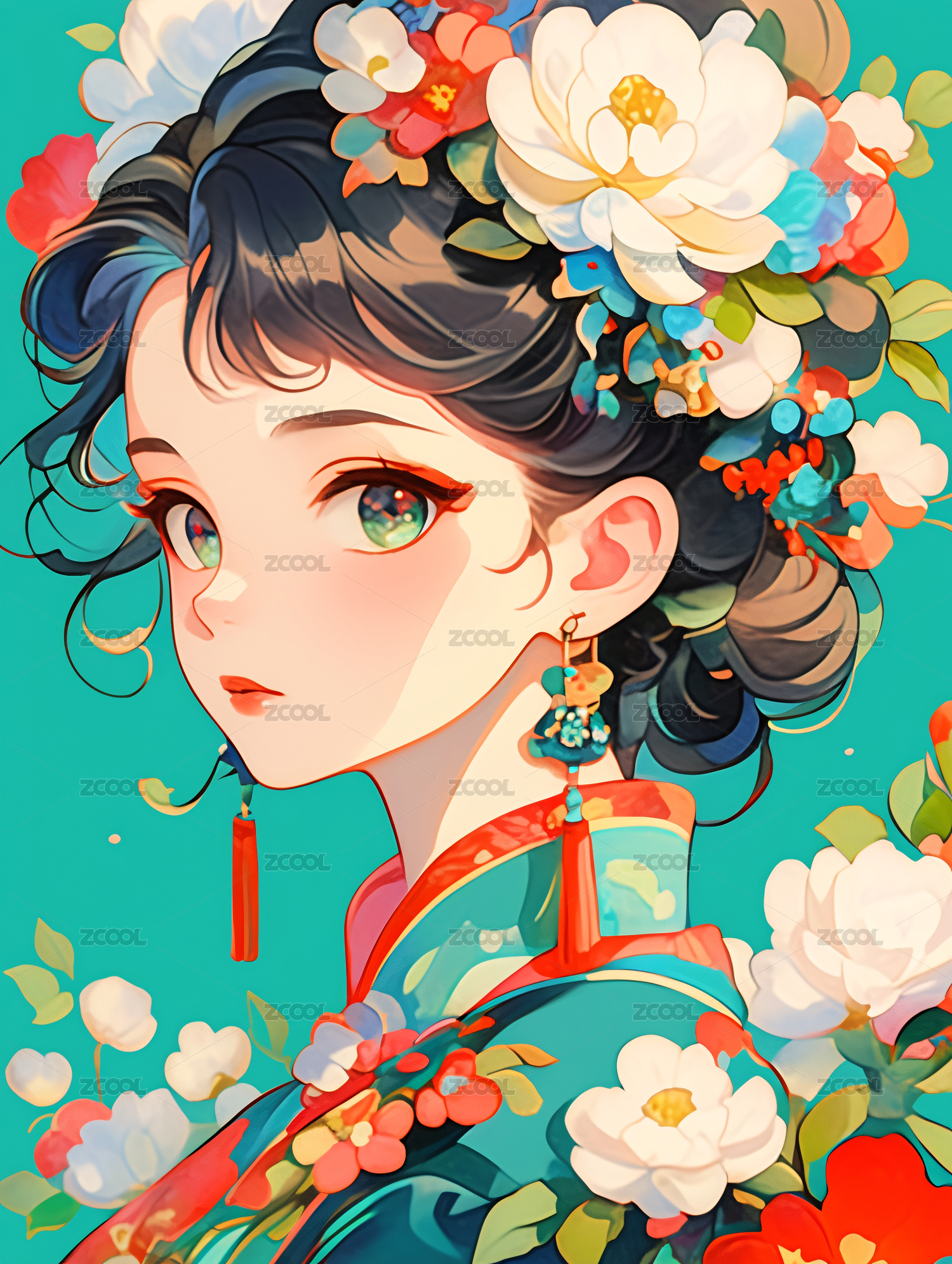 头戴鲜花簪花卡通美女插画