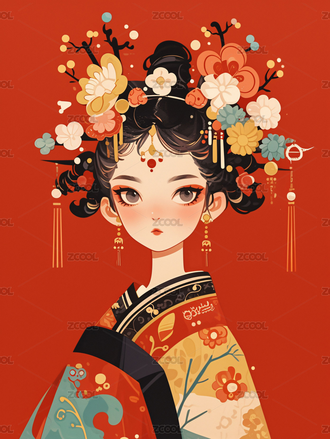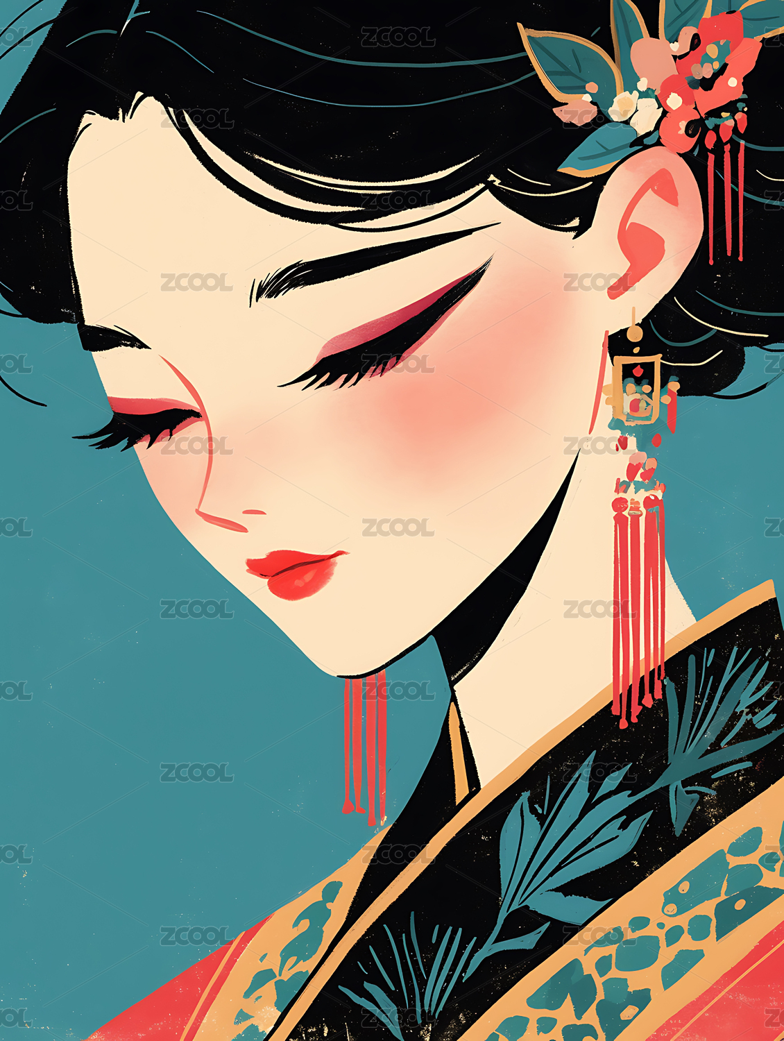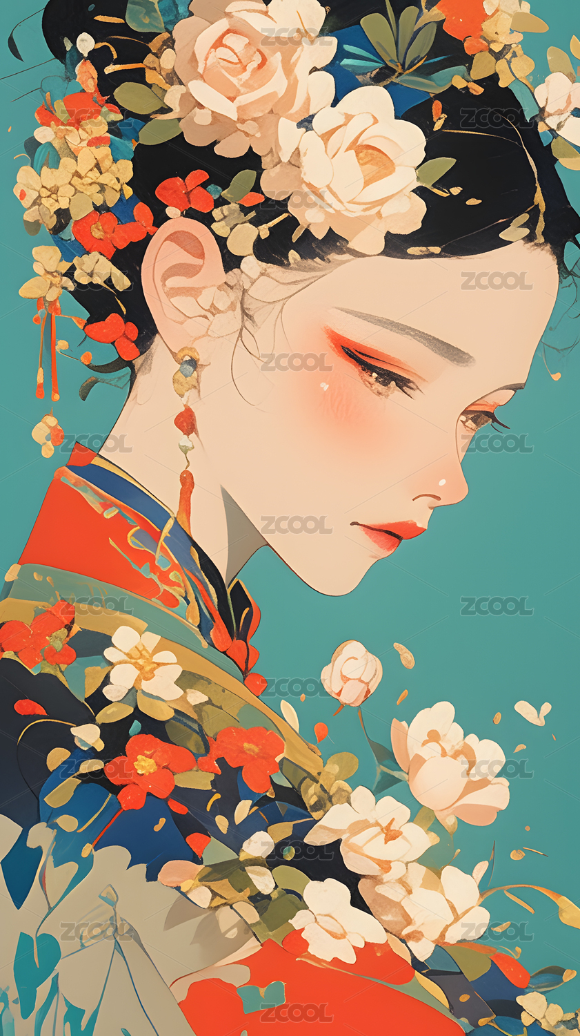 国潮风彩色美女人物插画