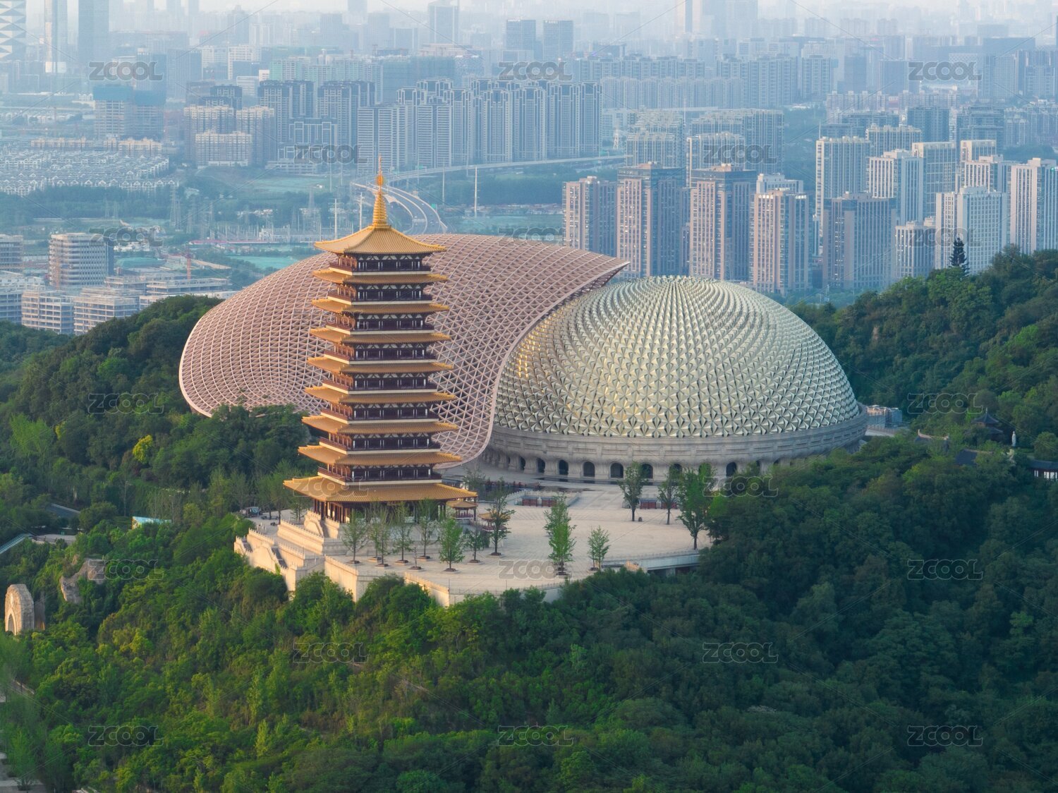 航拍日出时的南京牛首山佛顶宫与佛顶塔