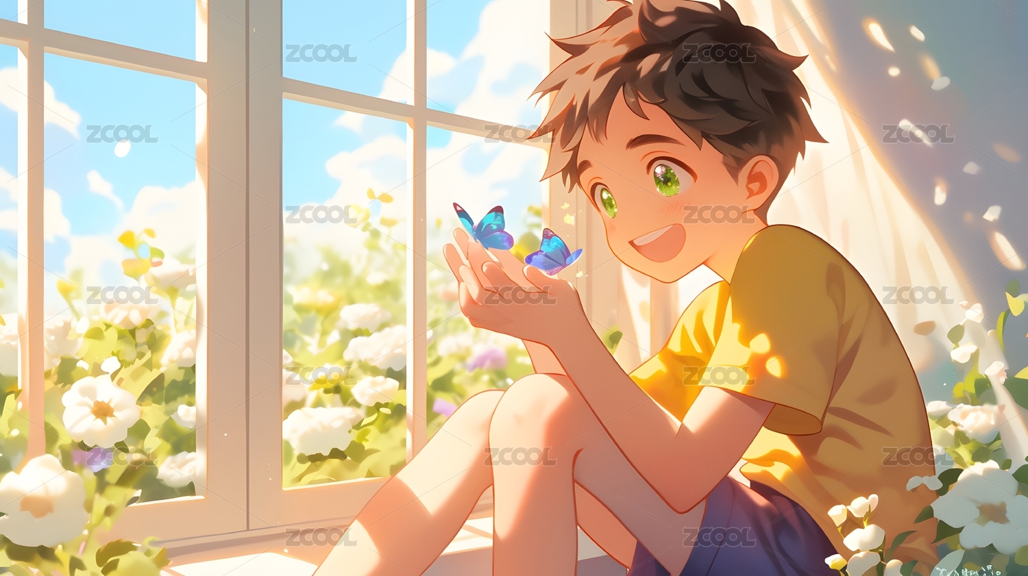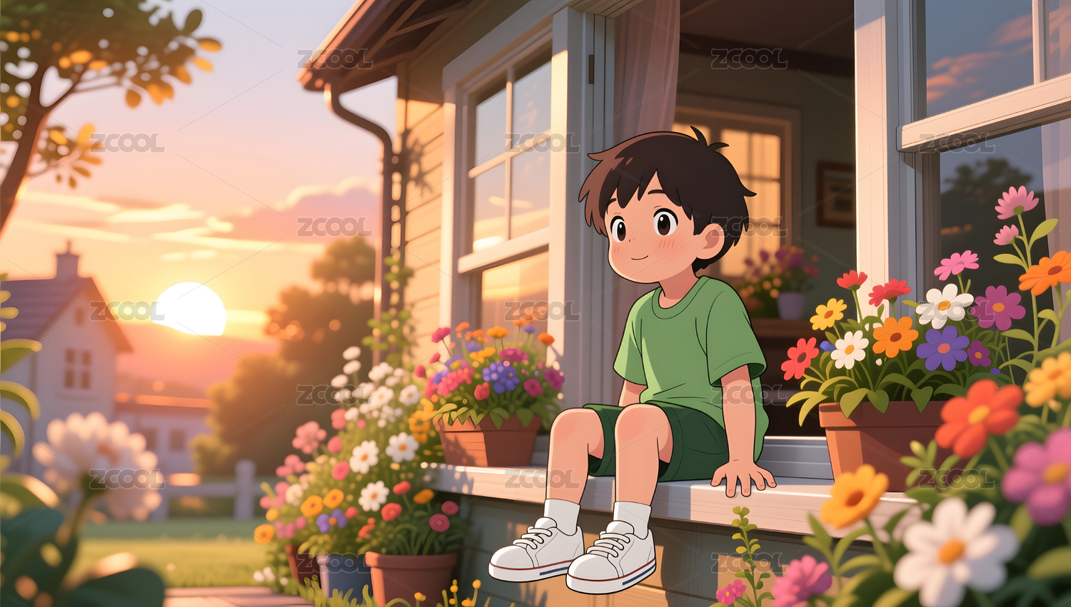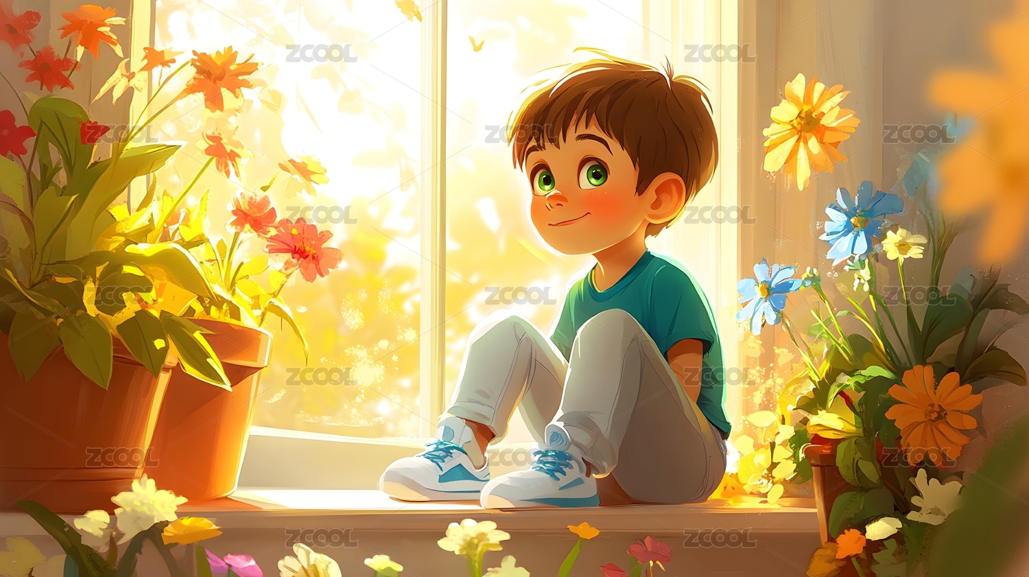 动漫风,童趣,孤独,留守,儿童,蓝天,宁静,想象,放松,日光