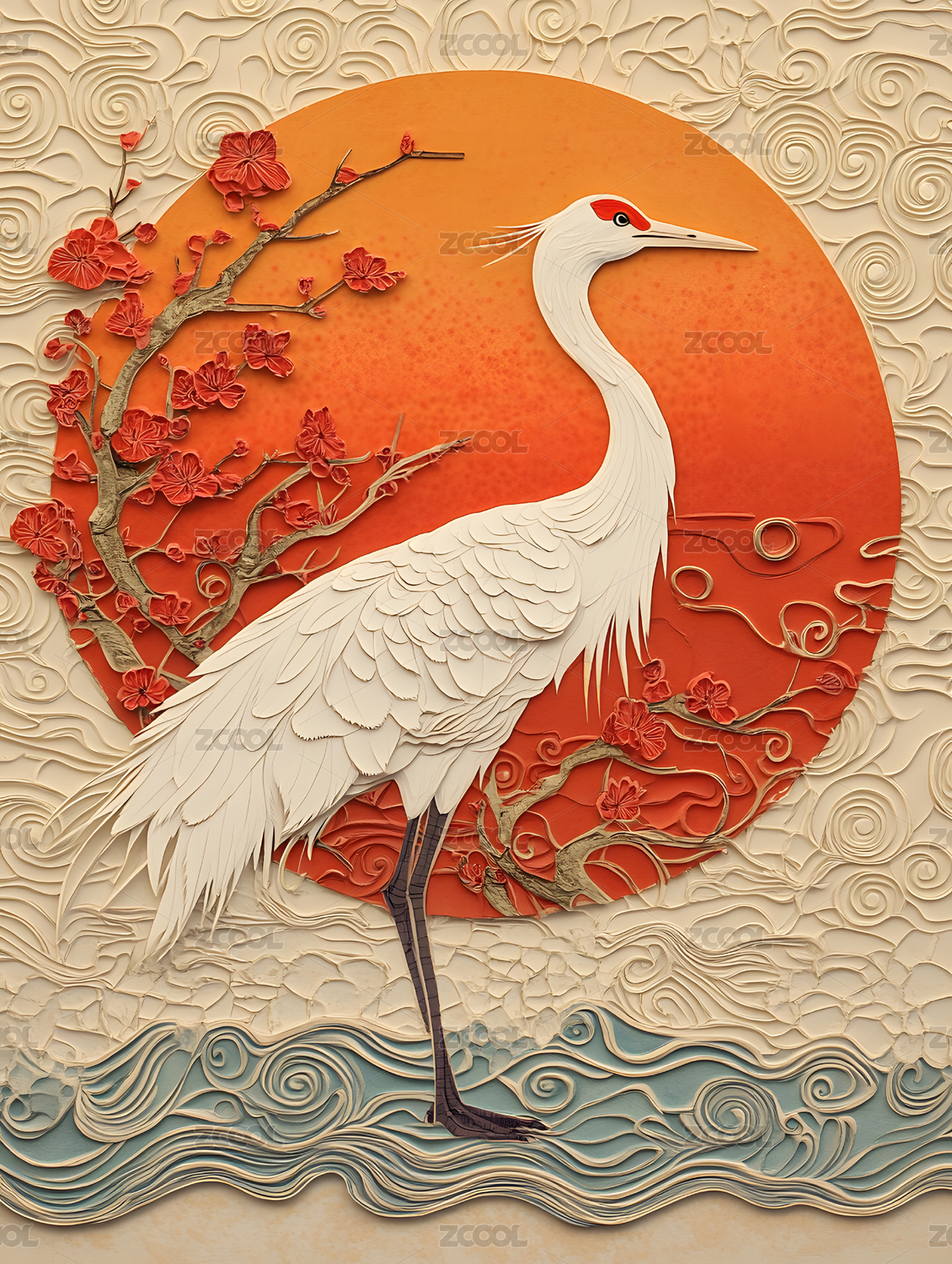 丹顶鹤红日红梅波涛