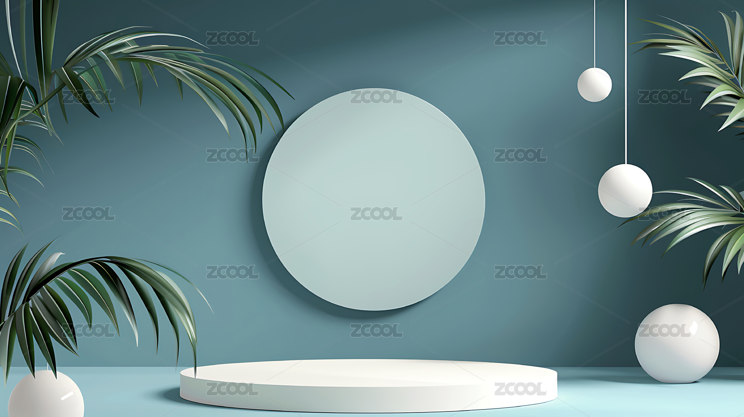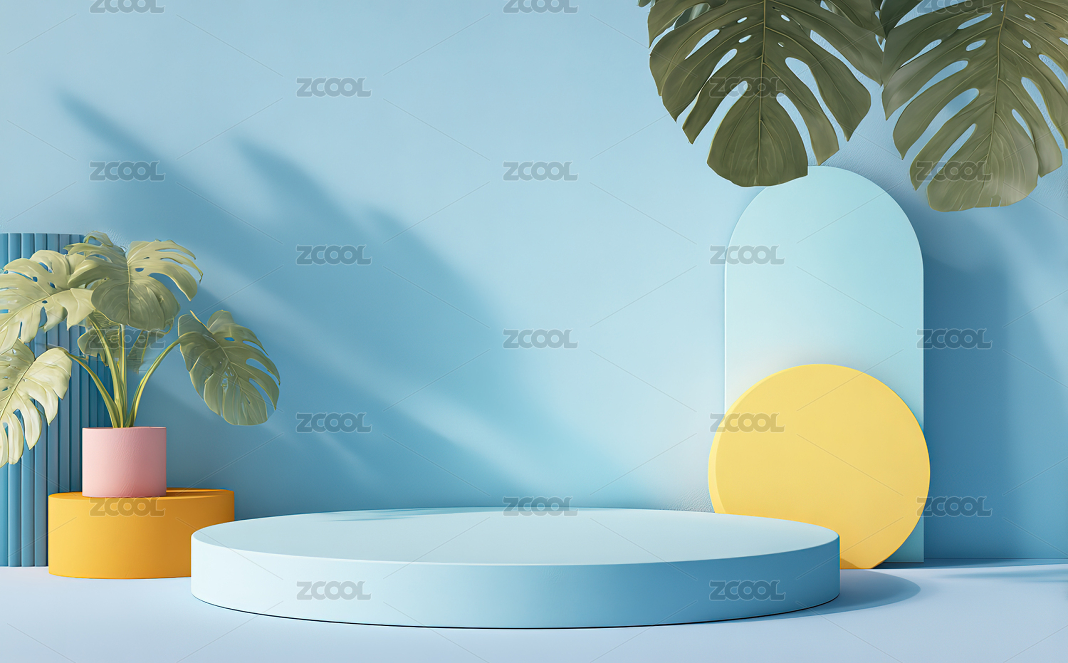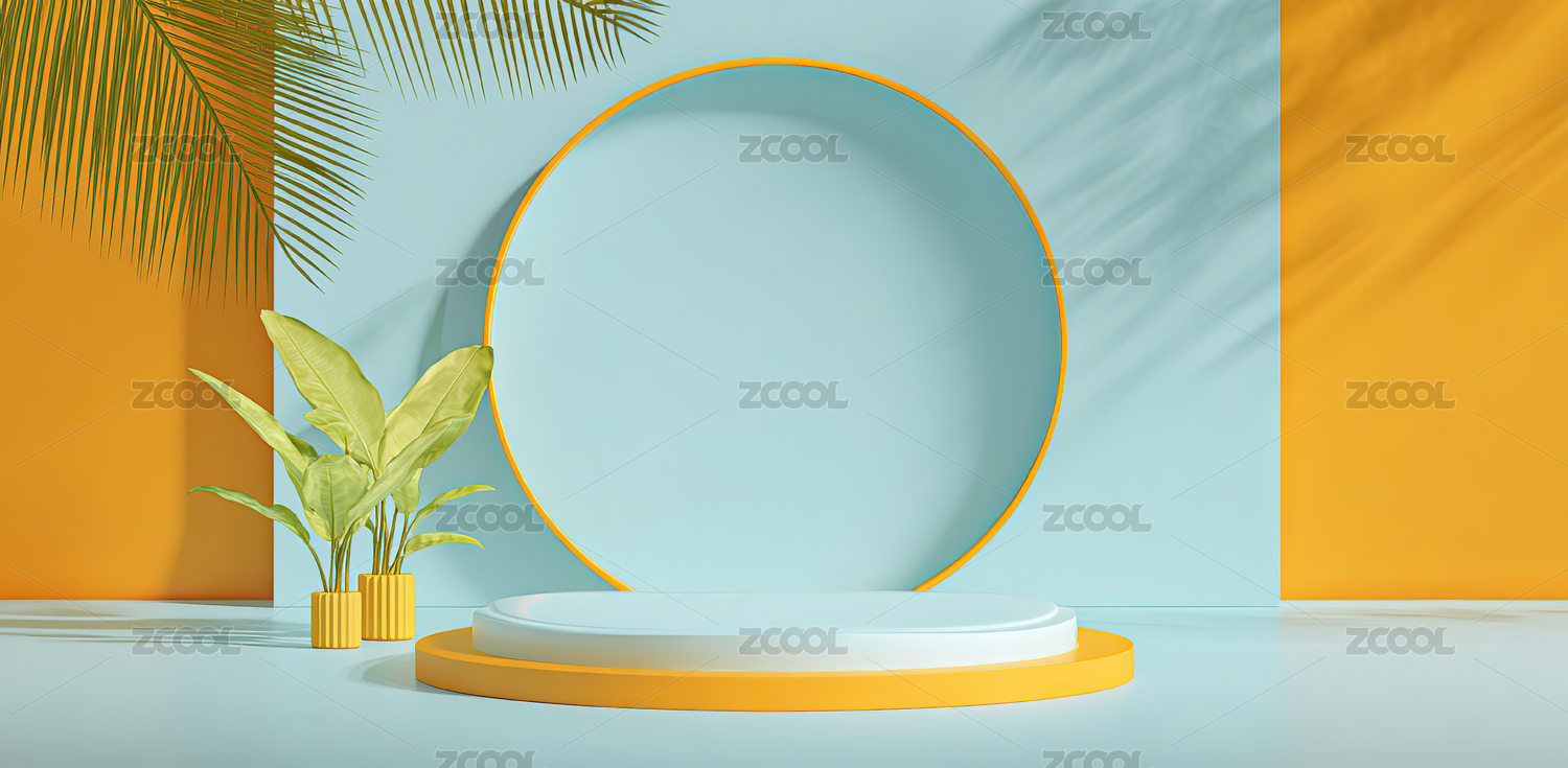 蓝色几何舞台与绿植装饰