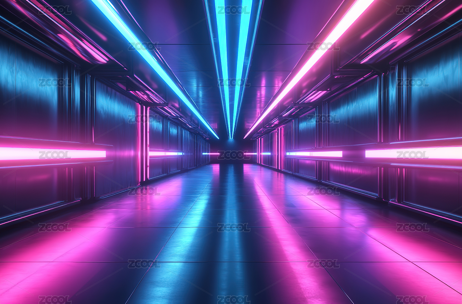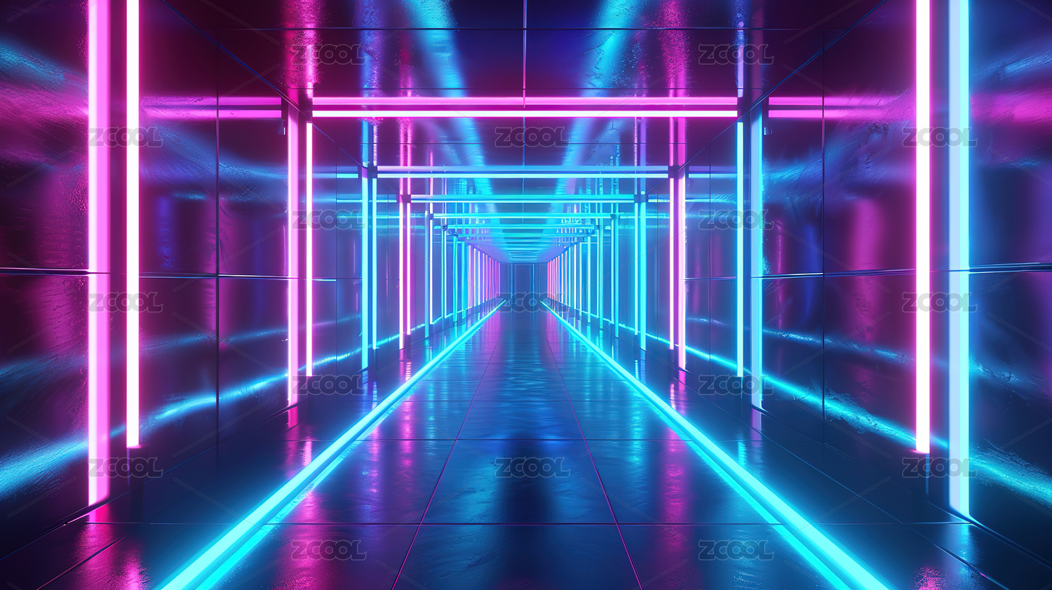 抽象科技感荧光色隧道走廊赛博朋克3D插画