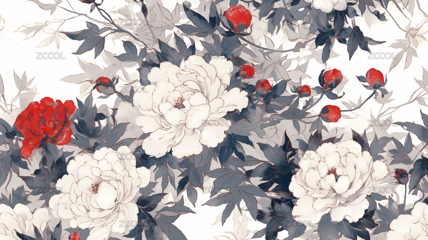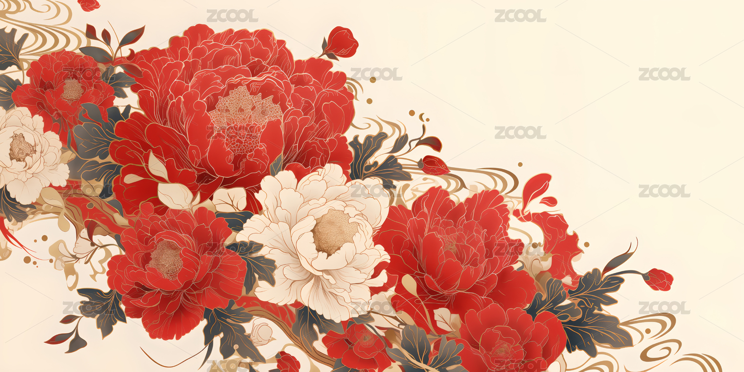 红色,牡丹,花,插画,花头,特写,花瓣,花簇,叶子,植物