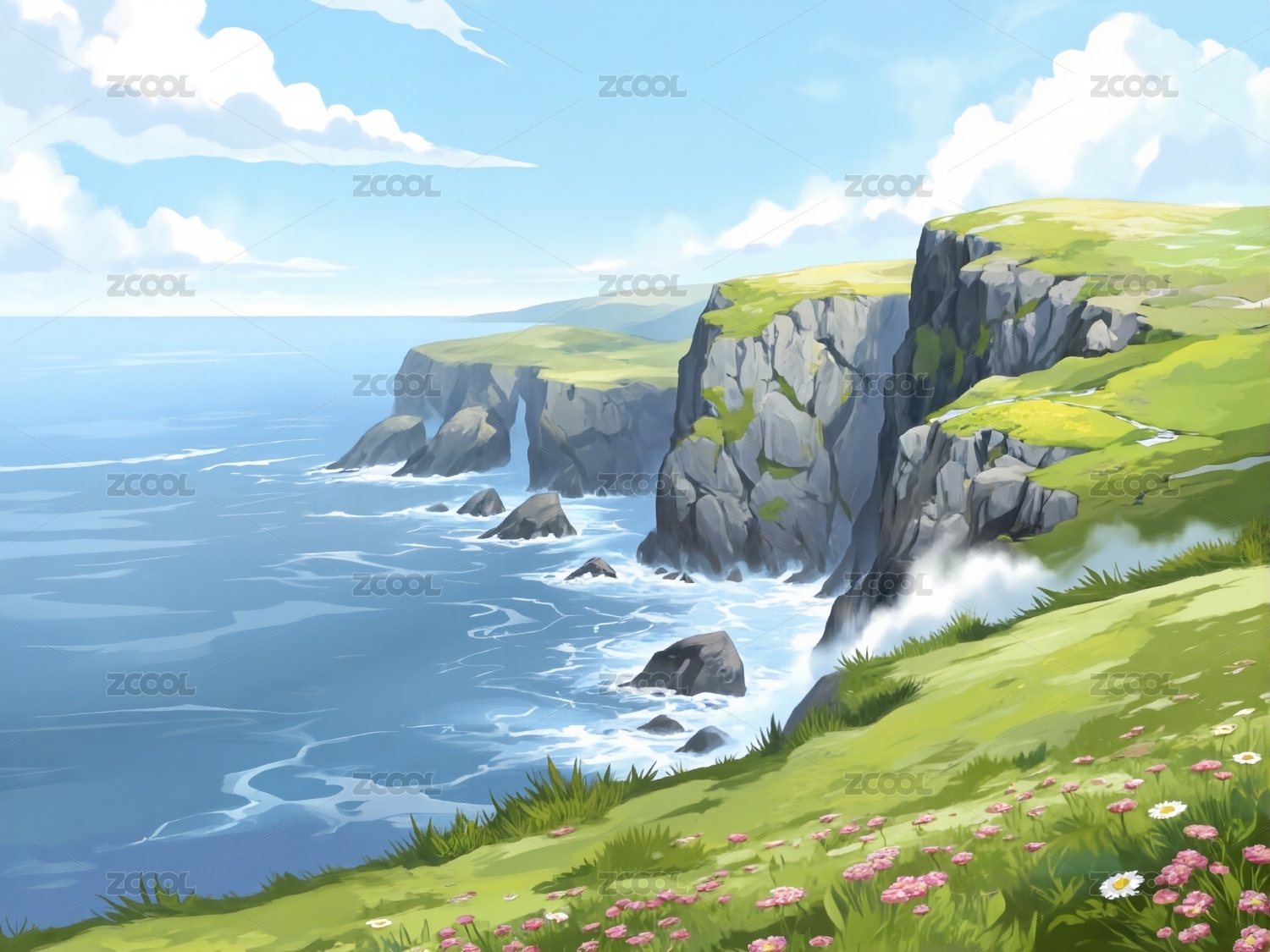 海洋,天空,风景,灯塔,插画,清新,蓝色,自然,夏天,户外