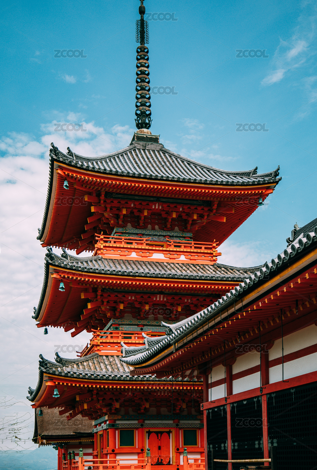日本京都春天蓝天白云下仰拍清水寺寺庙