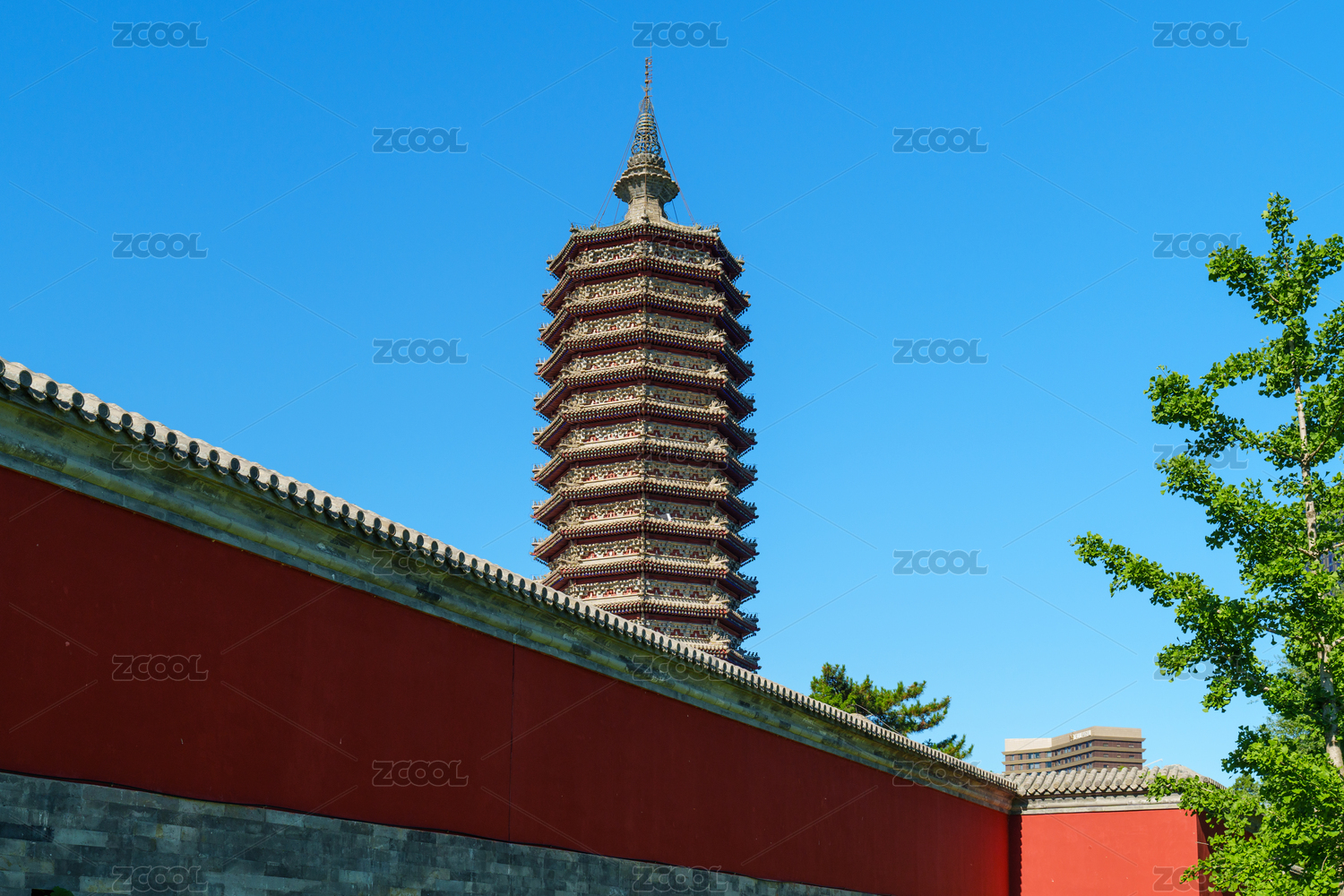 蓝天下的通州燃灯佛舍利塔与红墙灰瓦
