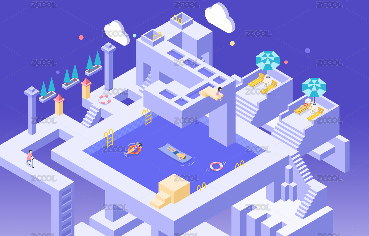 等距夏季游泳矢量插画
