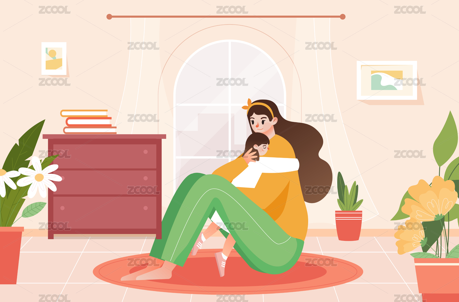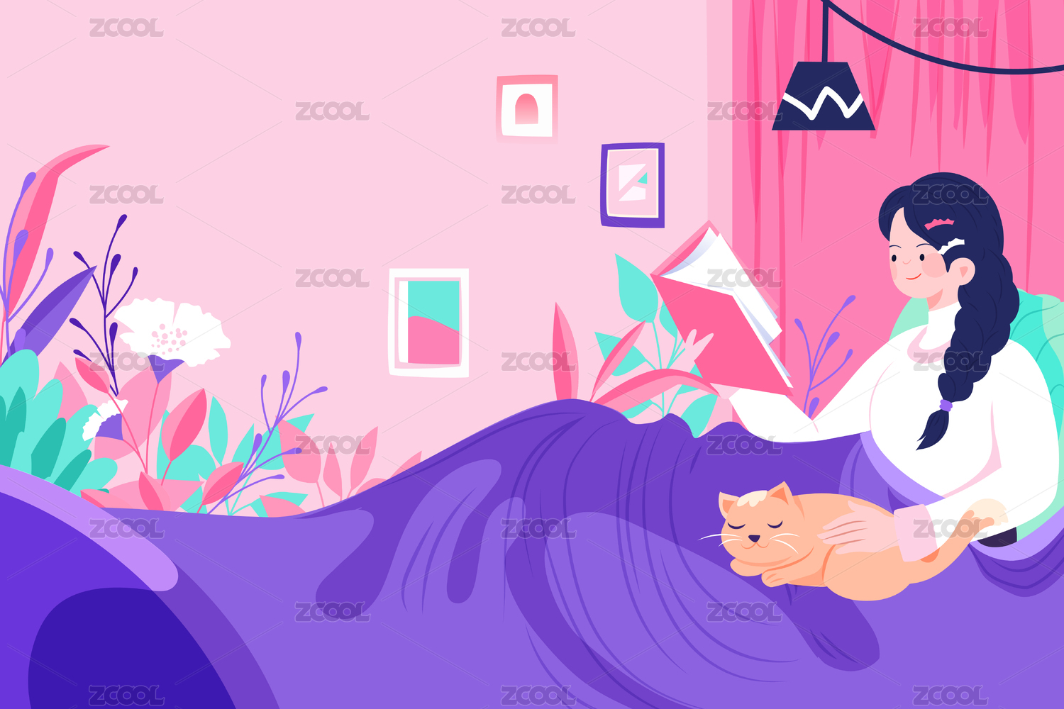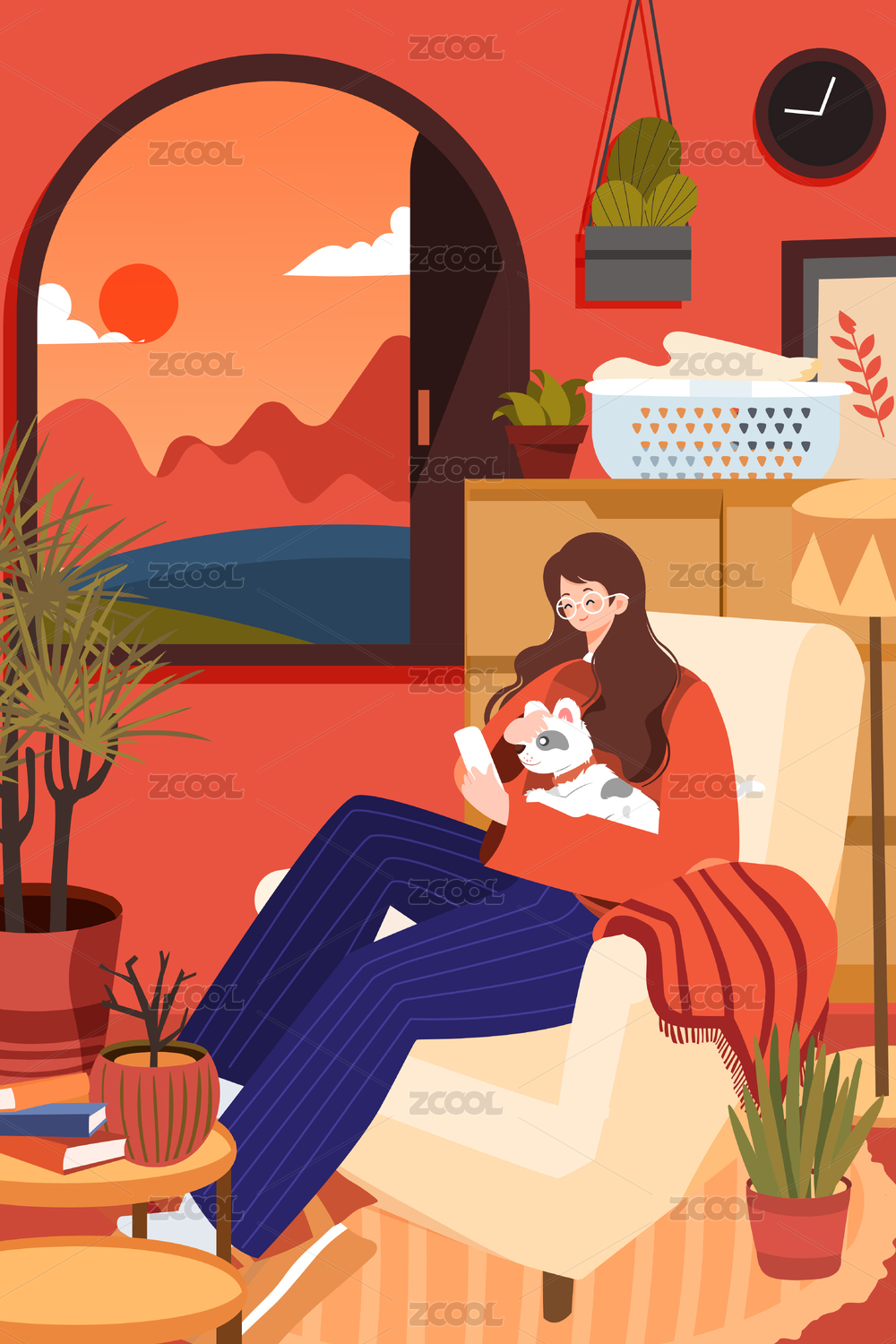 女孩坐在沙发上抱着猫咪盆栽生活插画