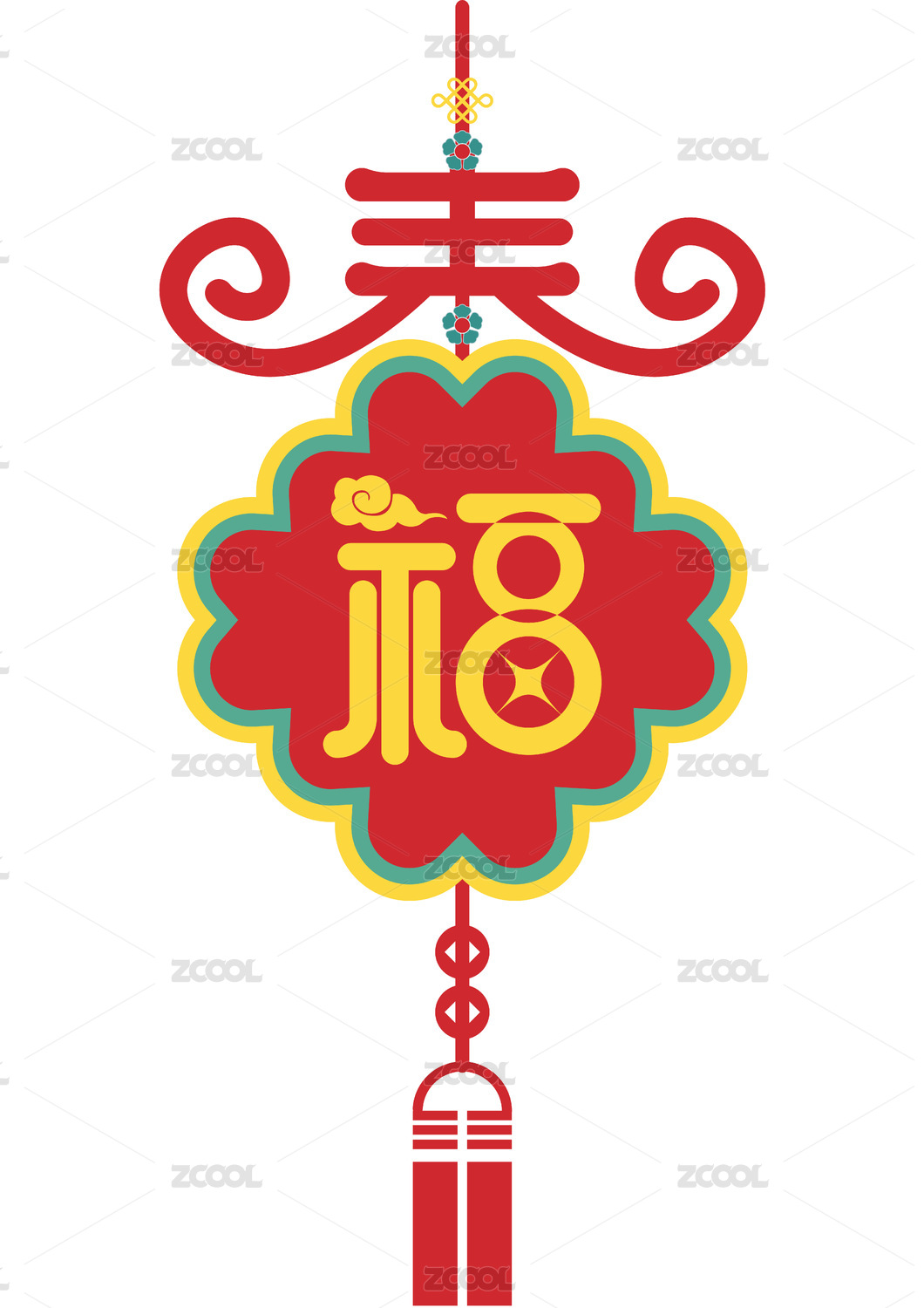 手写手绘汉字福字中国结艺术字门贴矢量插画