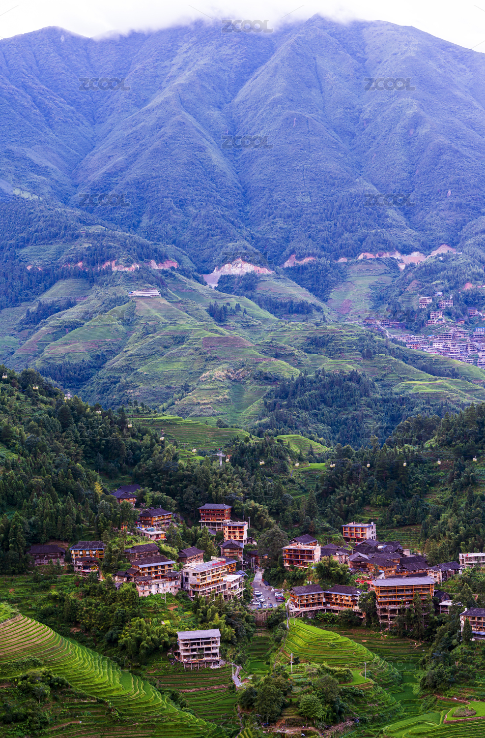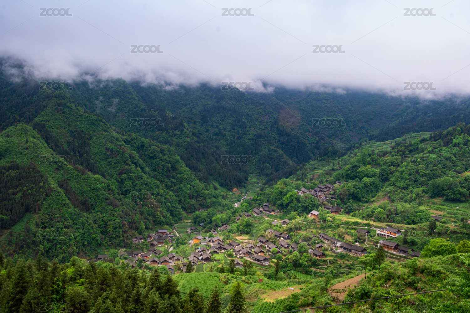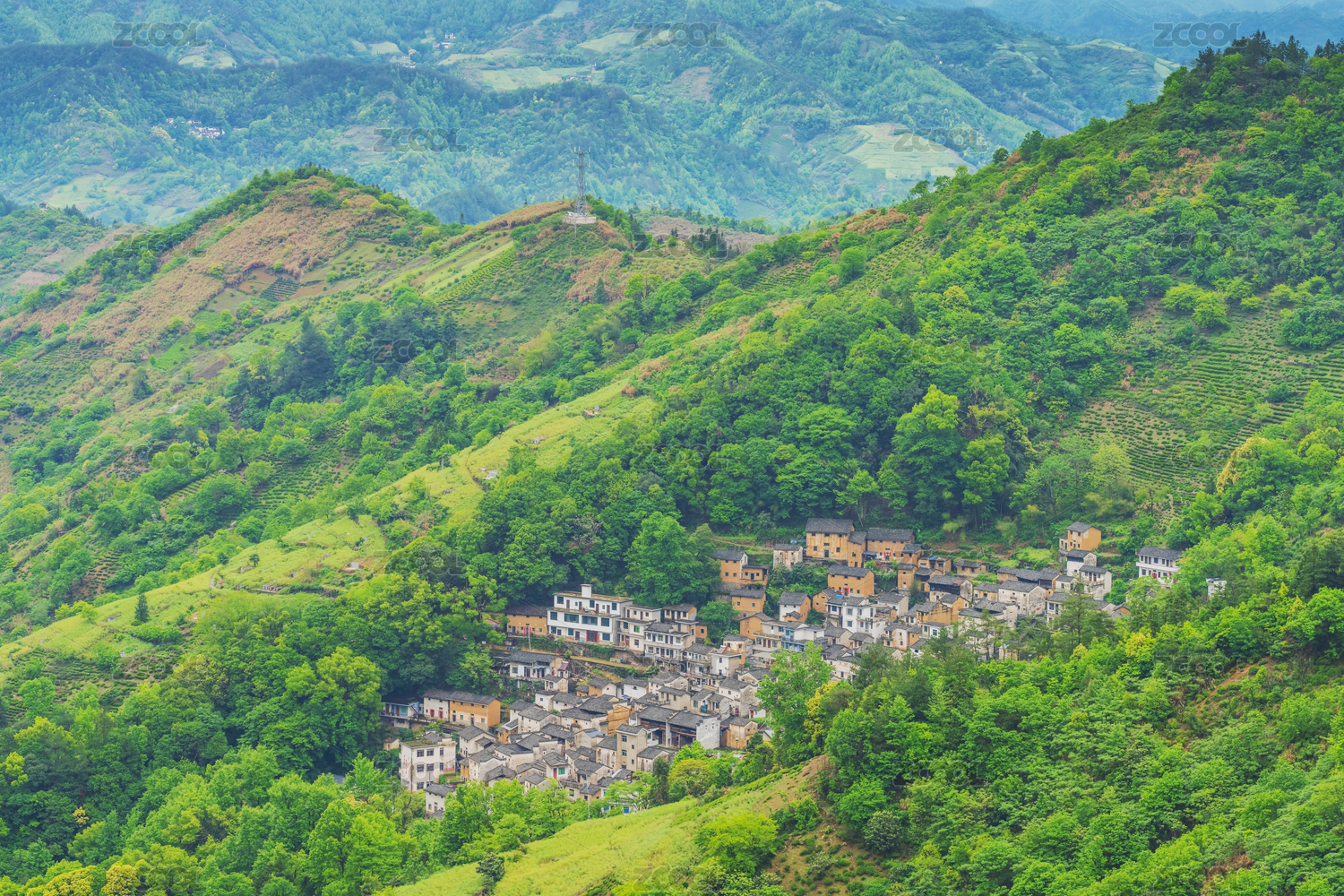 中国安徽省的大洲源景区的高山峡谷和美丽村