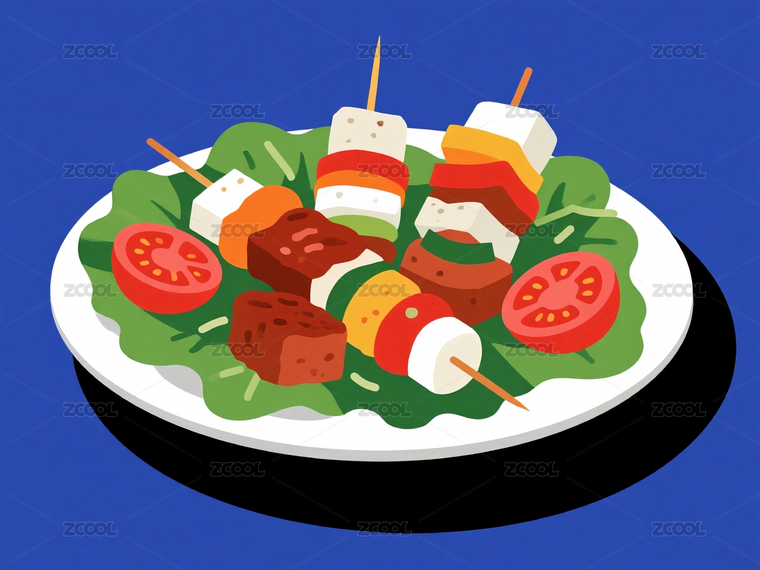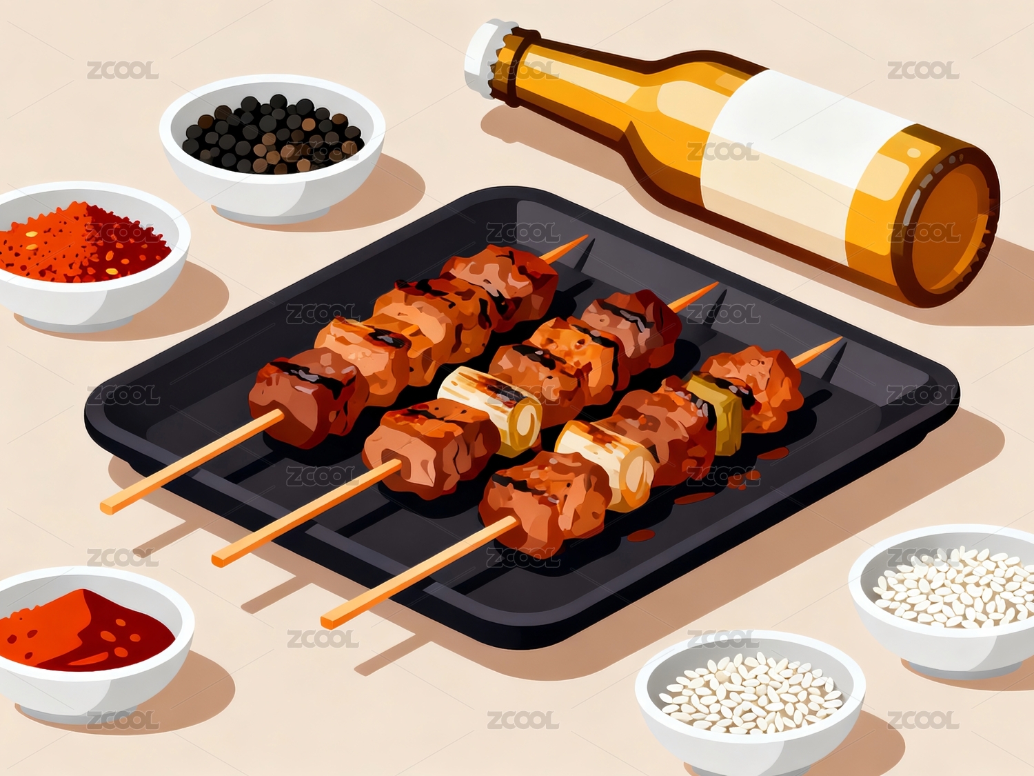 桌面盘中的烤串炸串肉串涮串插画绘画手绘