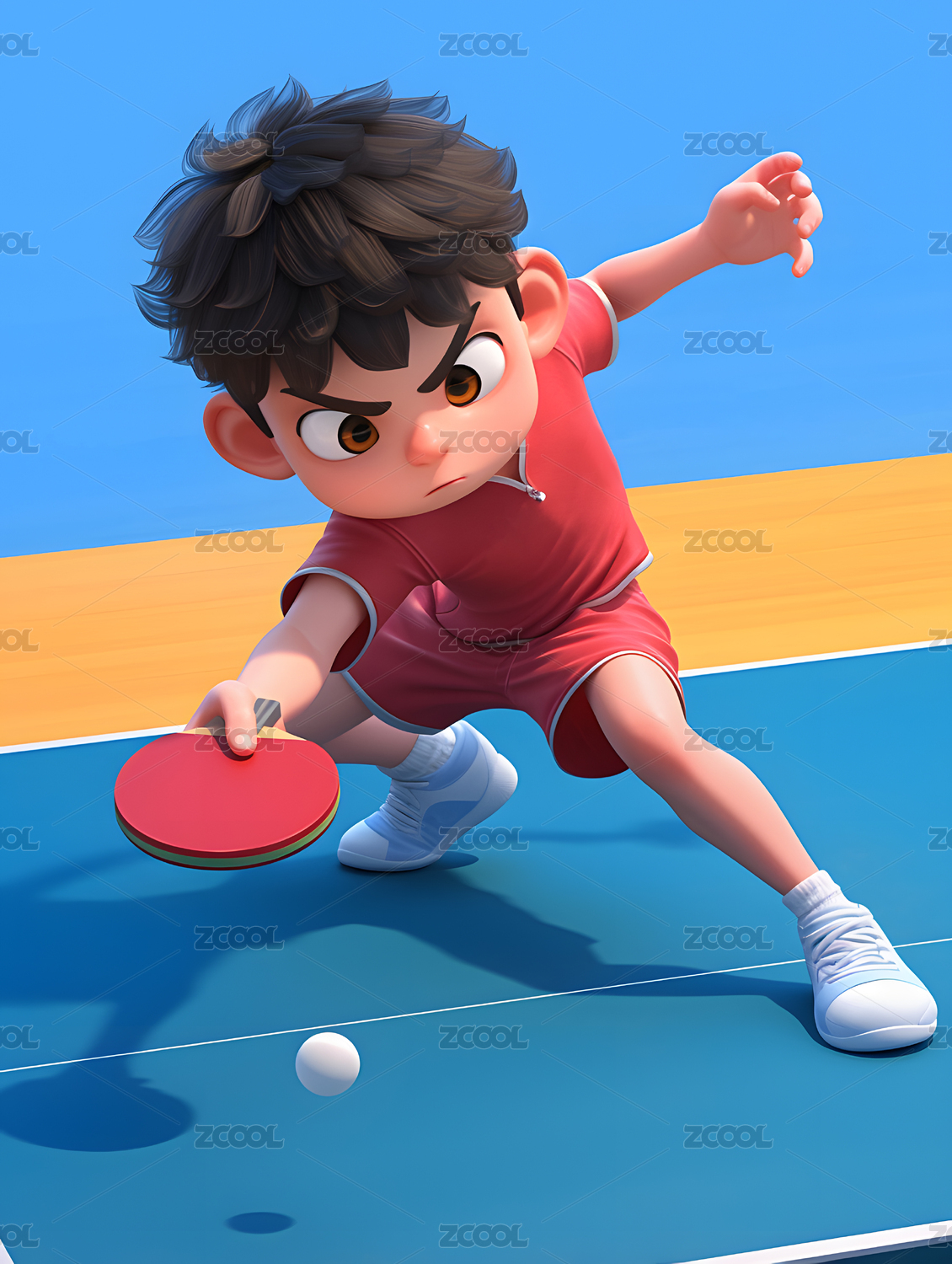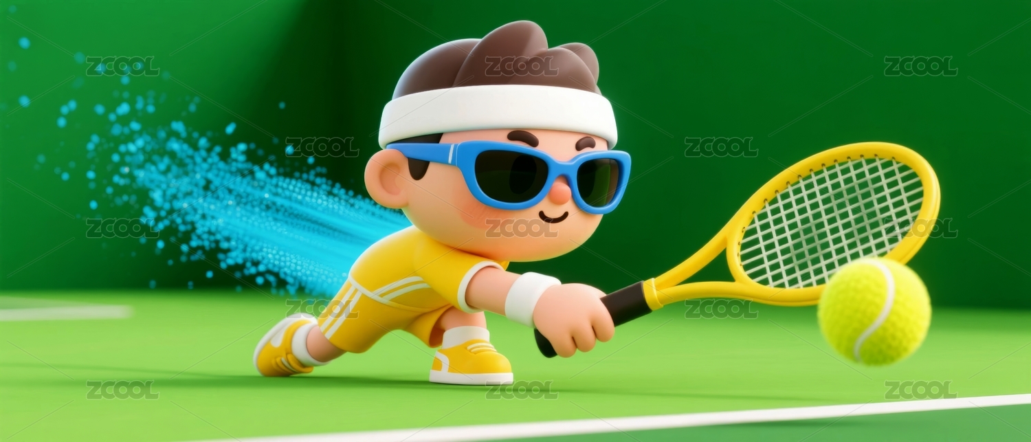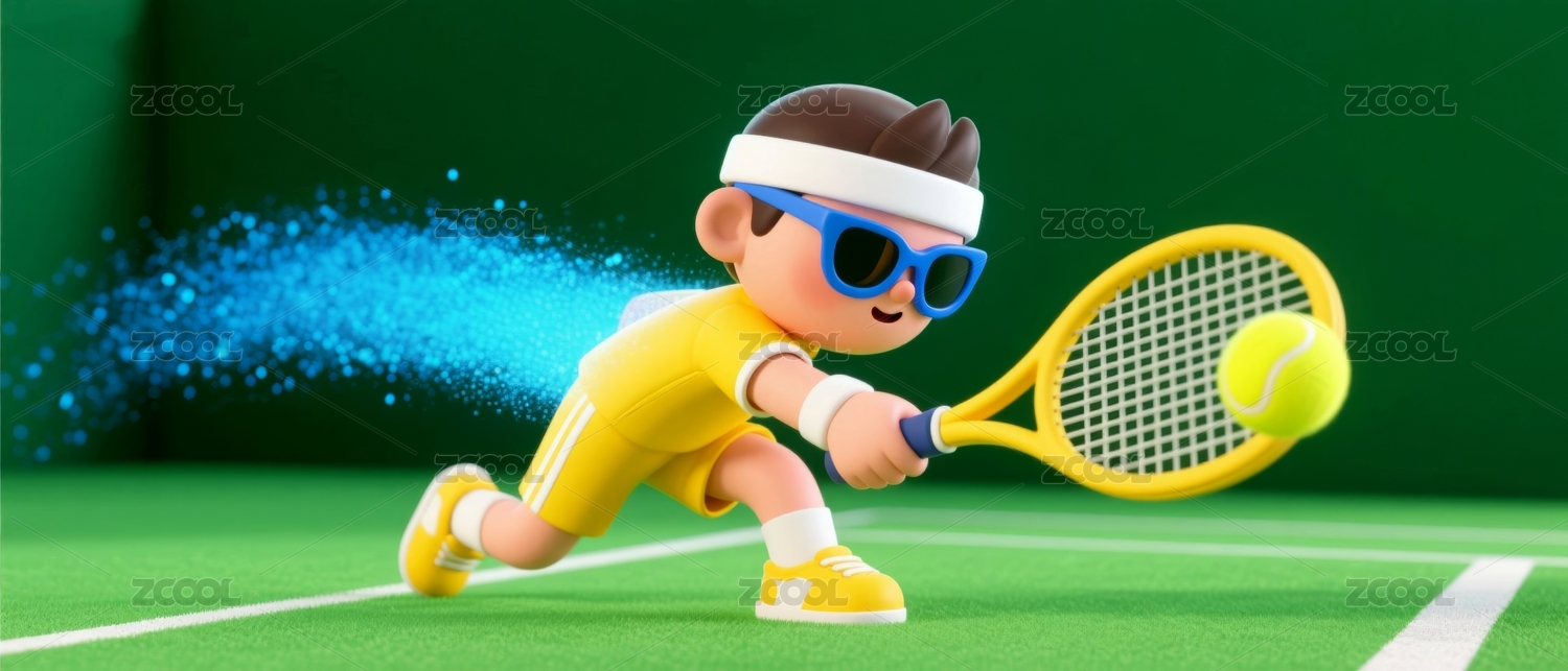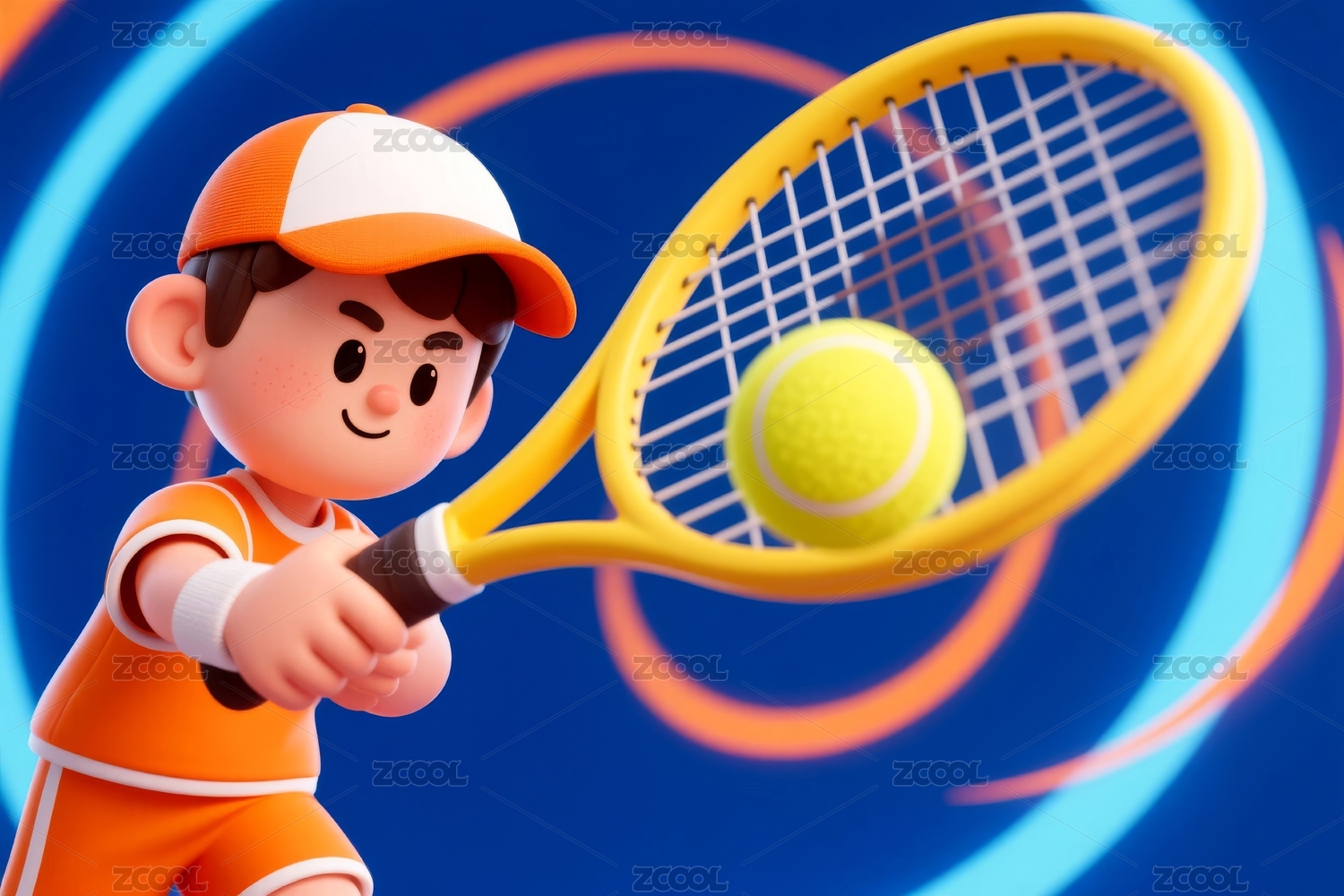 在网球场上拿着网球拍和球的卡通男孩高清图