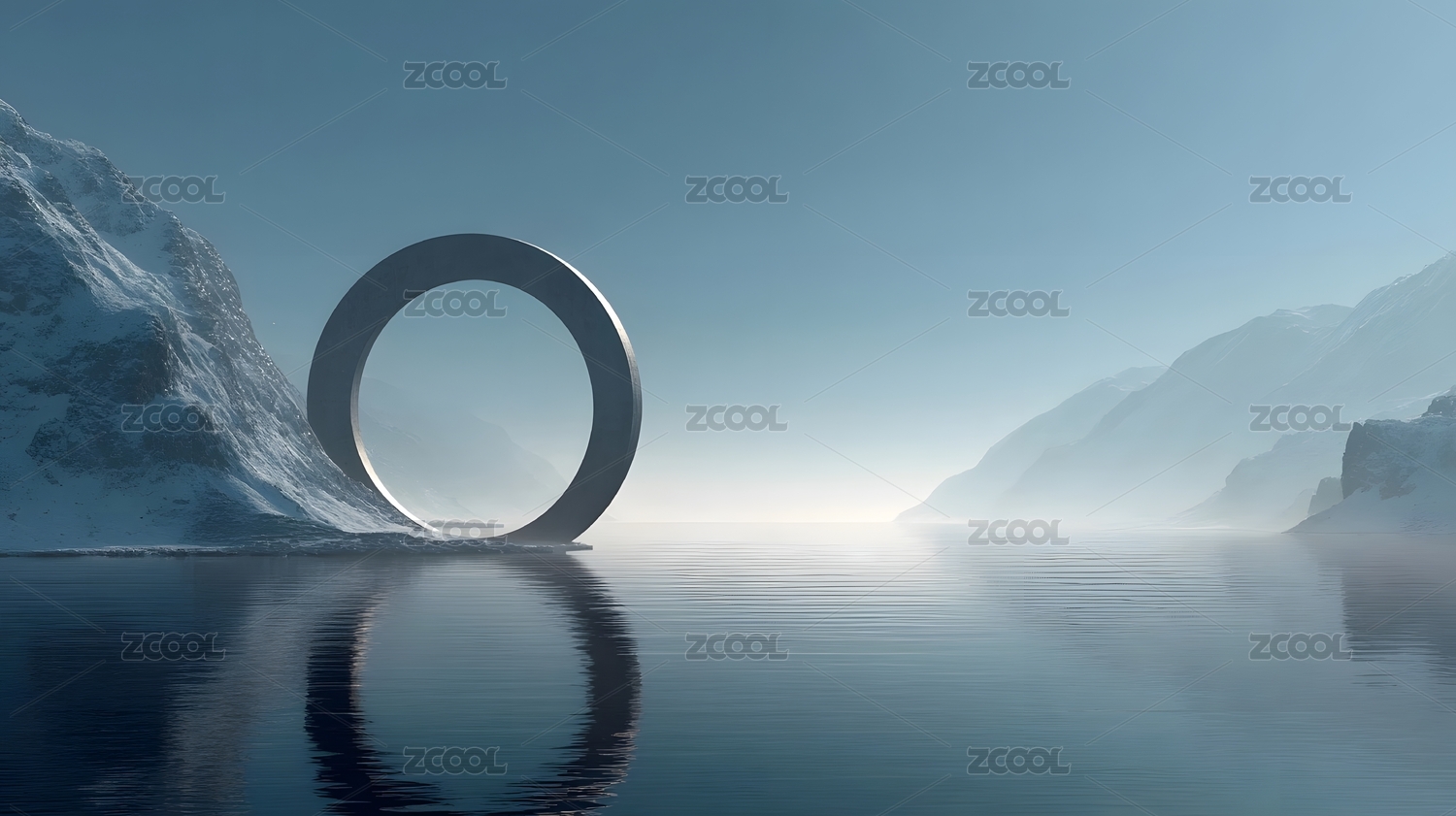 雪山湖面与悬浮圆环的奇幻景象