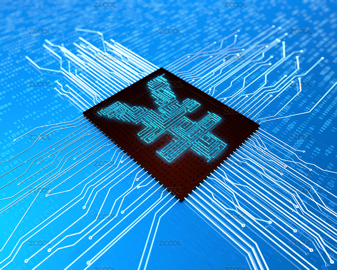 电子金融科技,网络数据传输,电路板与货币符号,人民币符号