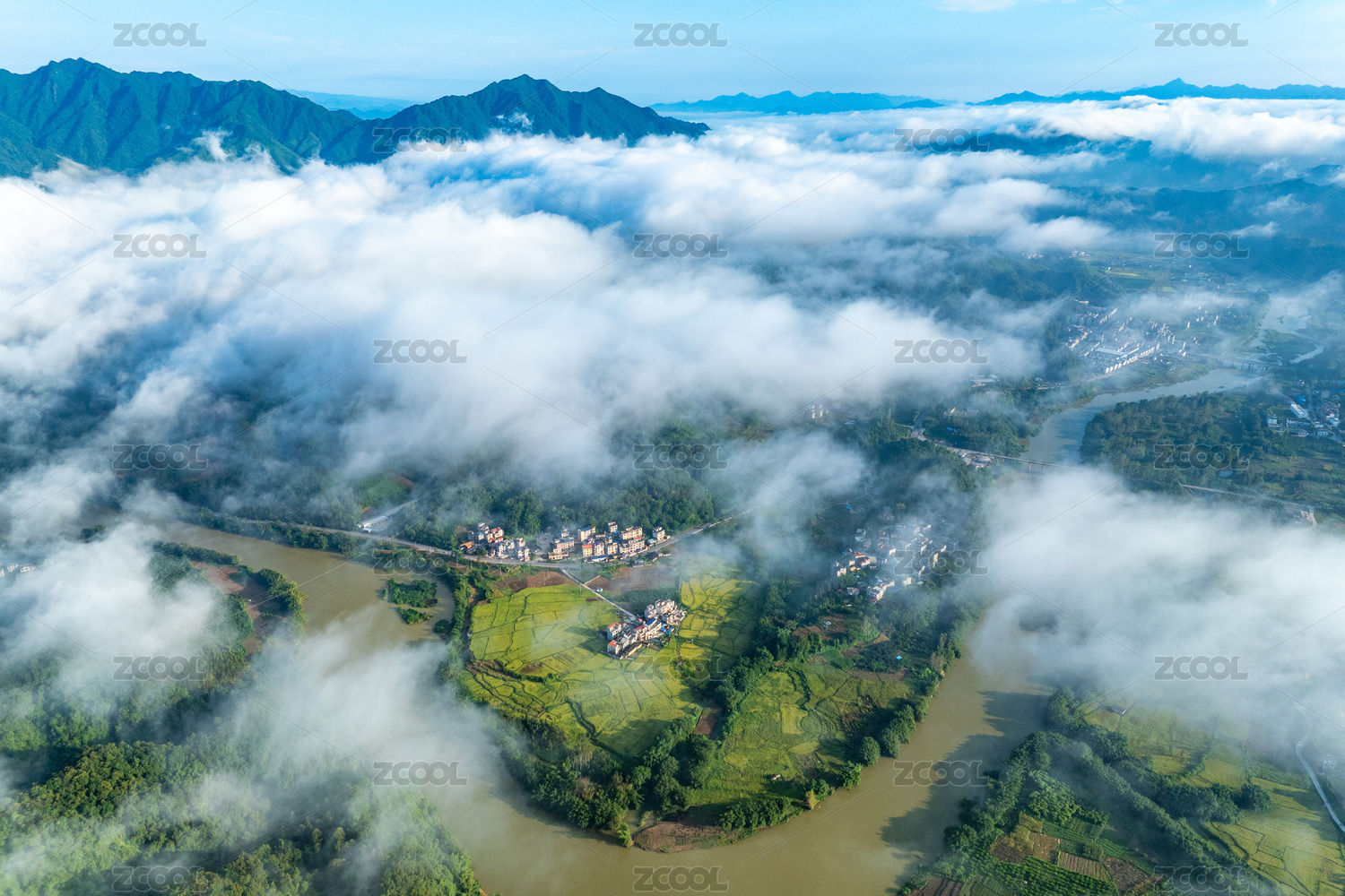乡村夏日村庄田园稻田河流晨雾晨曦日出风光