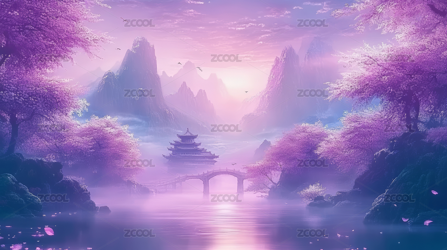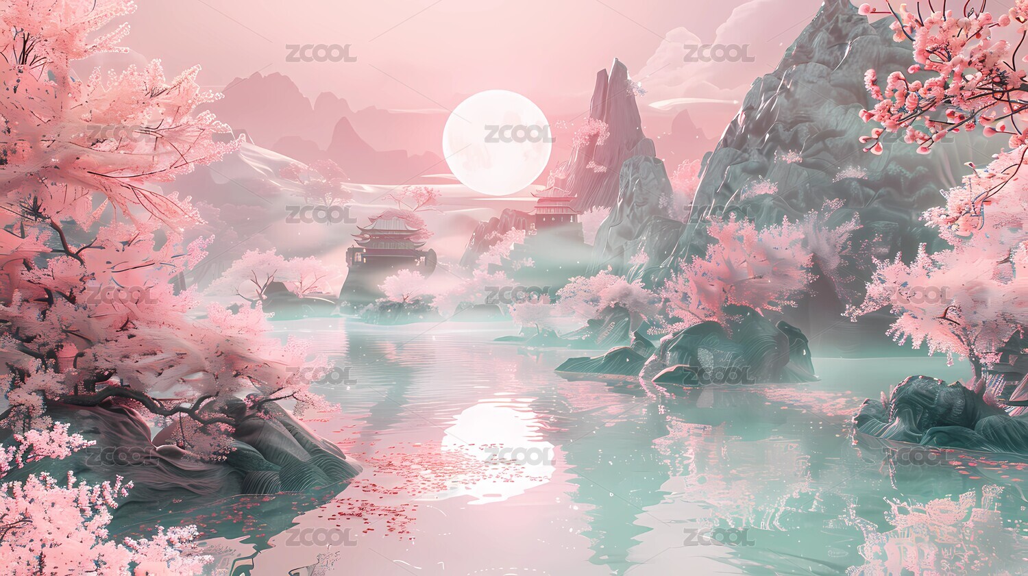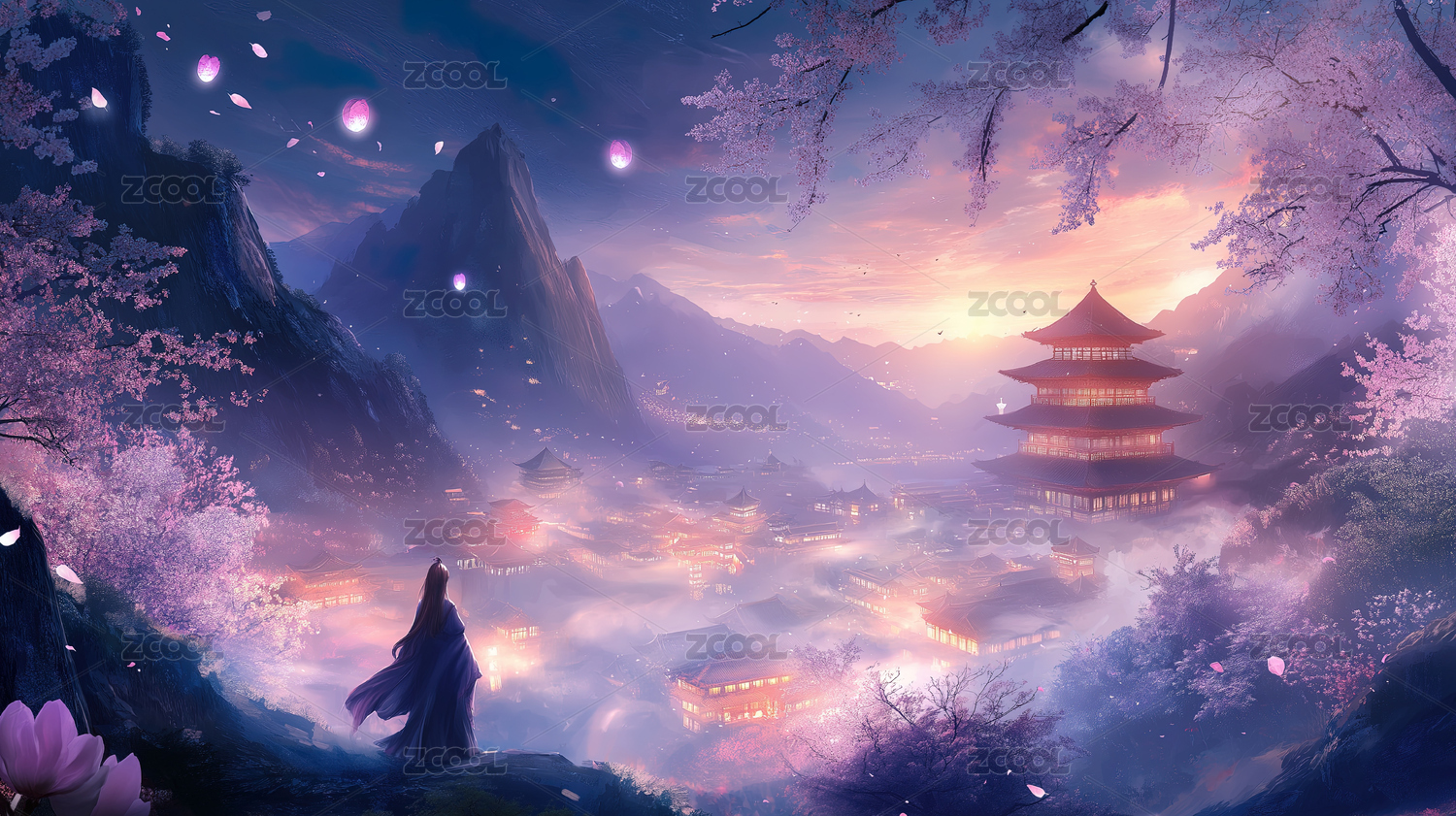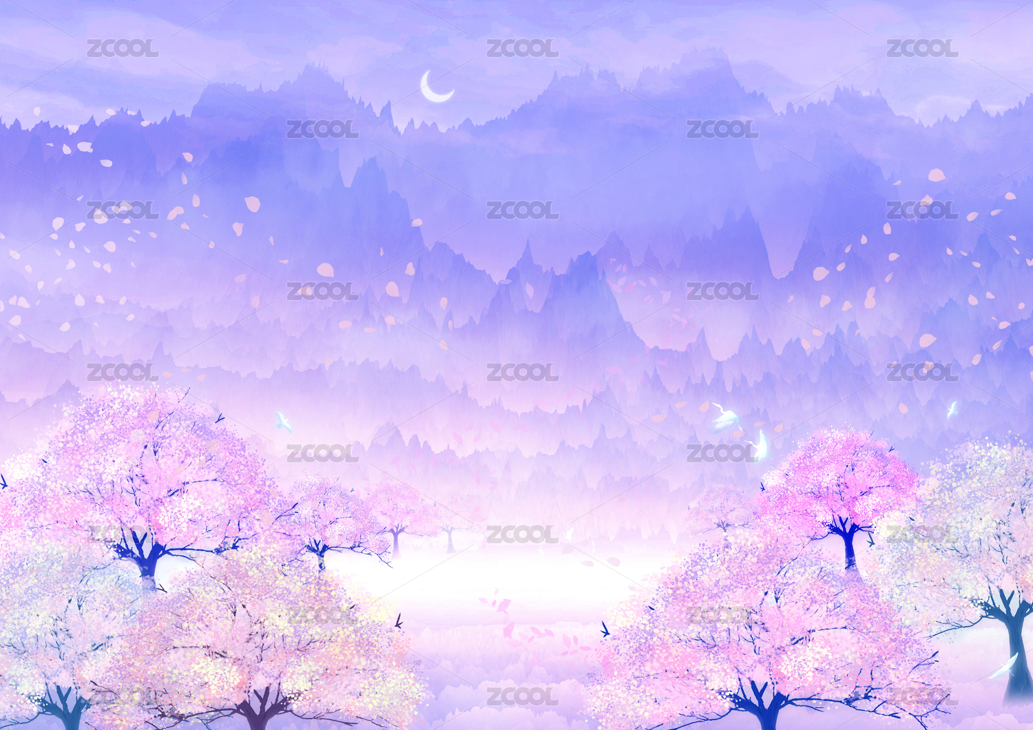 夜晚山谷中桃花林里花瓣飞舞,月亮悬挂在天空插画背景