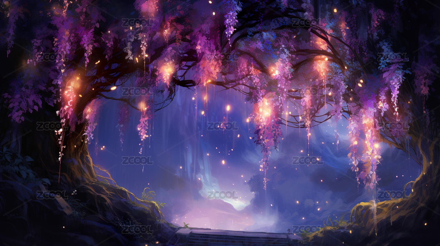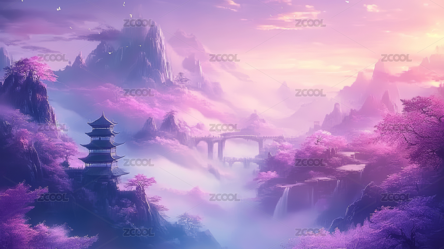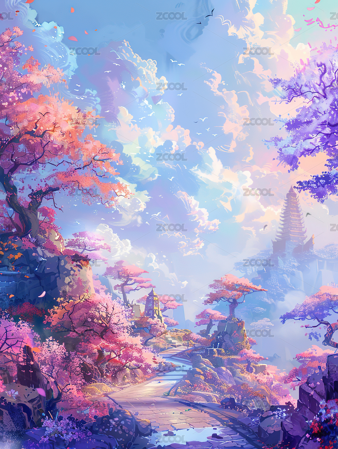 夜晚山谷中桃花林里花瓣飞舞,月亮悬挂在天空插画背景