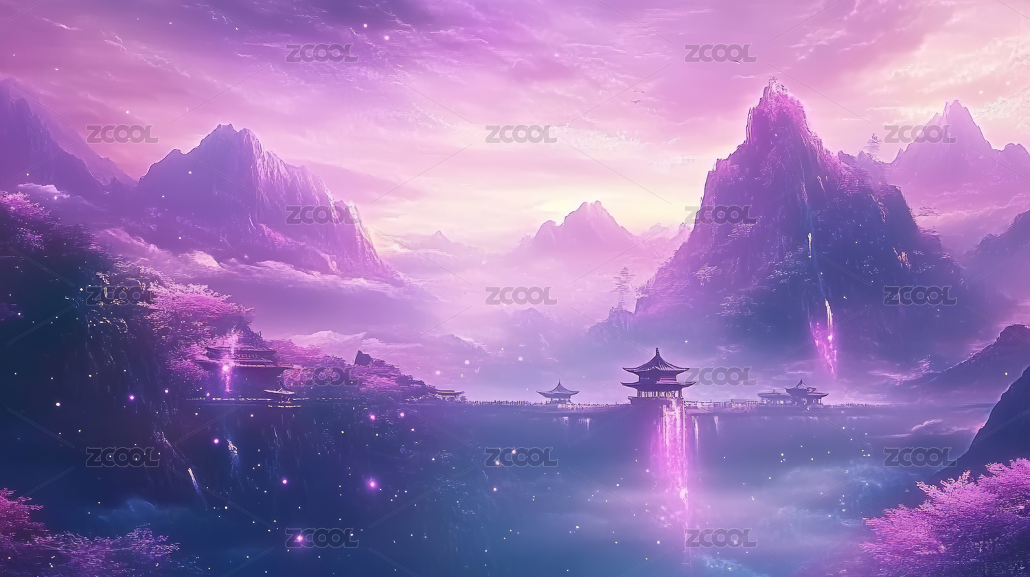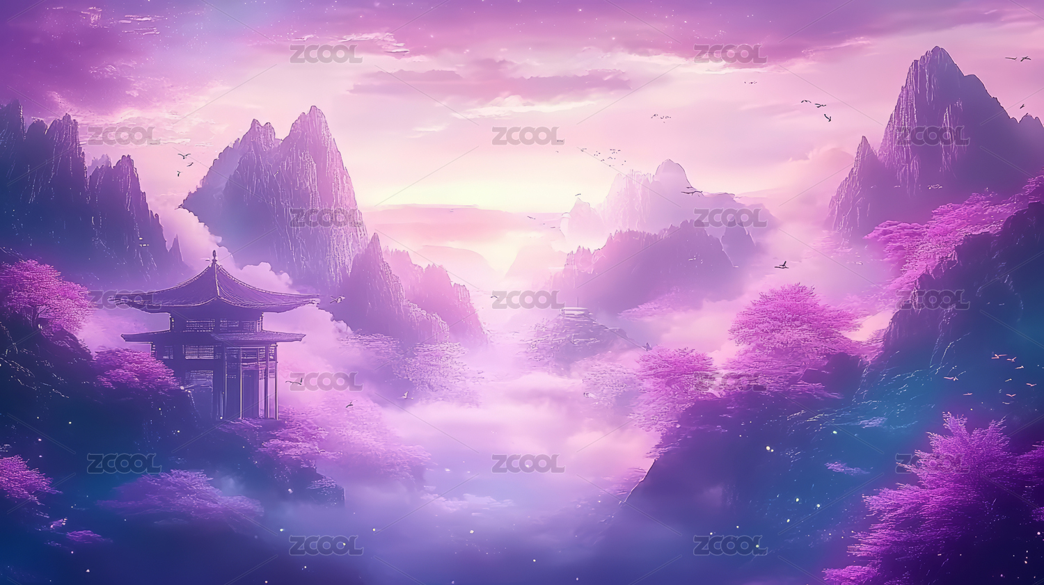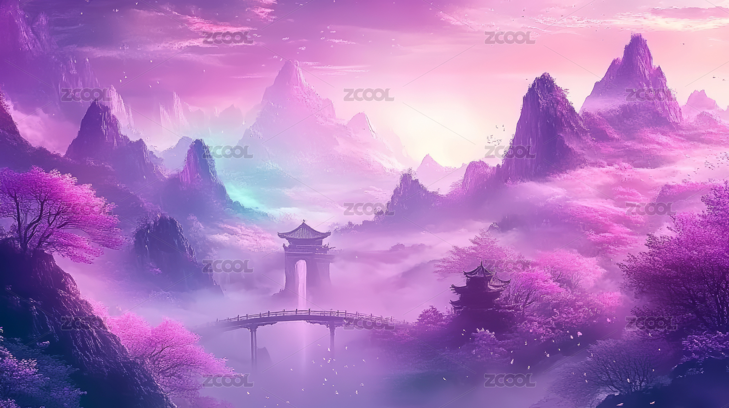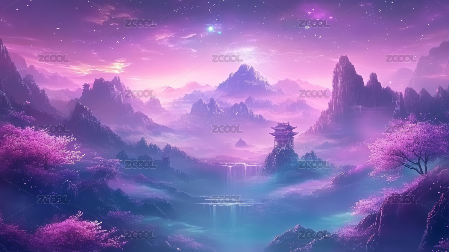 夜晚山谷中桃花林里花瓣飞舞,月亮悬挂在天空插画背景
