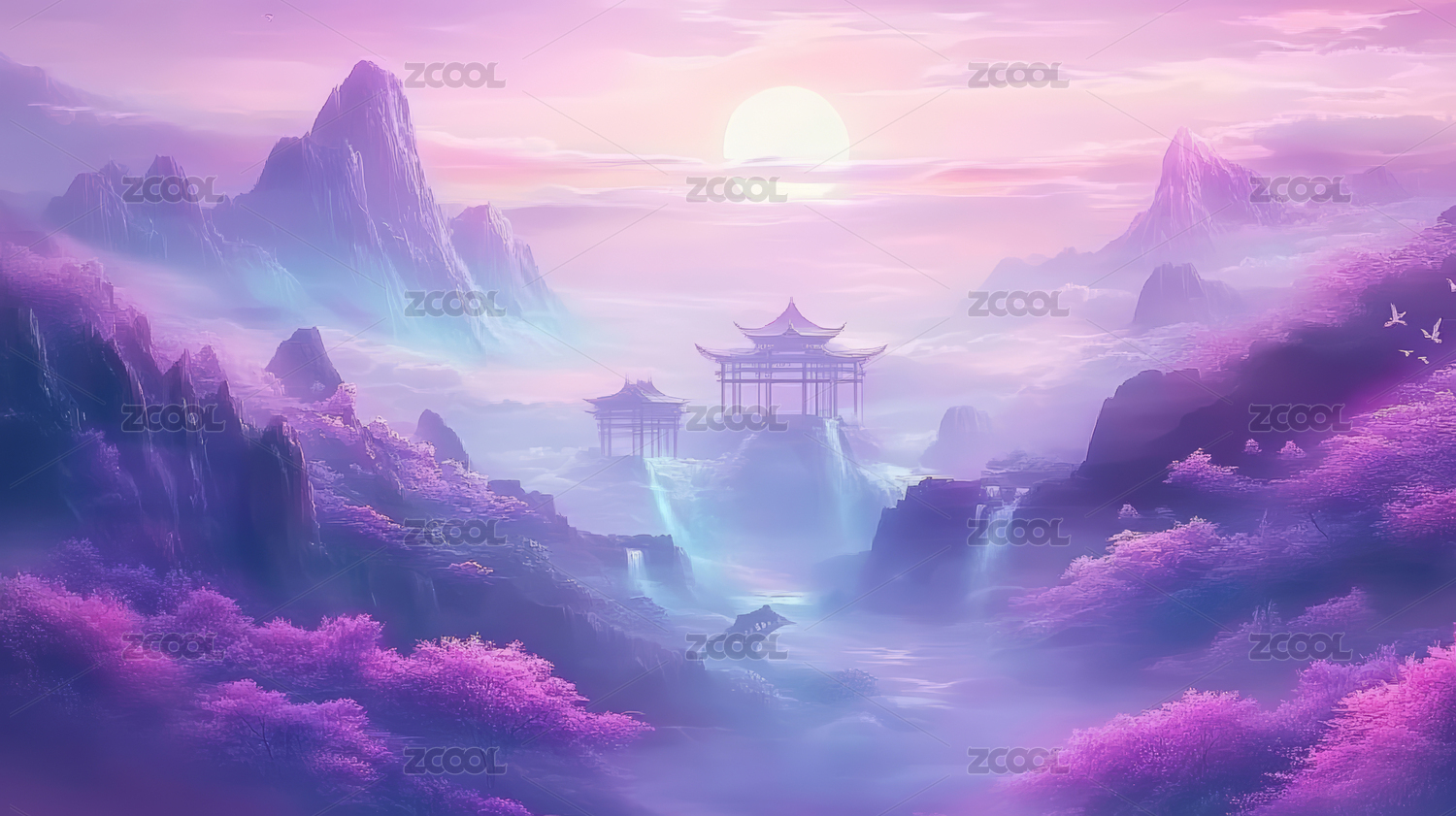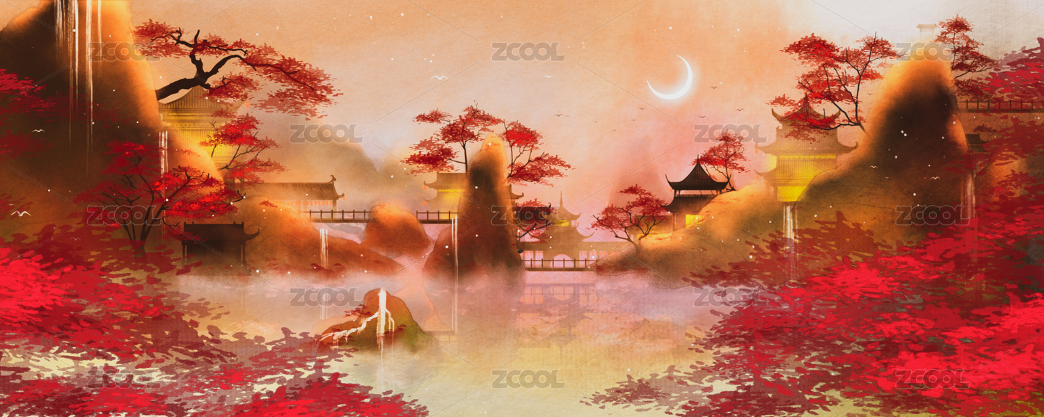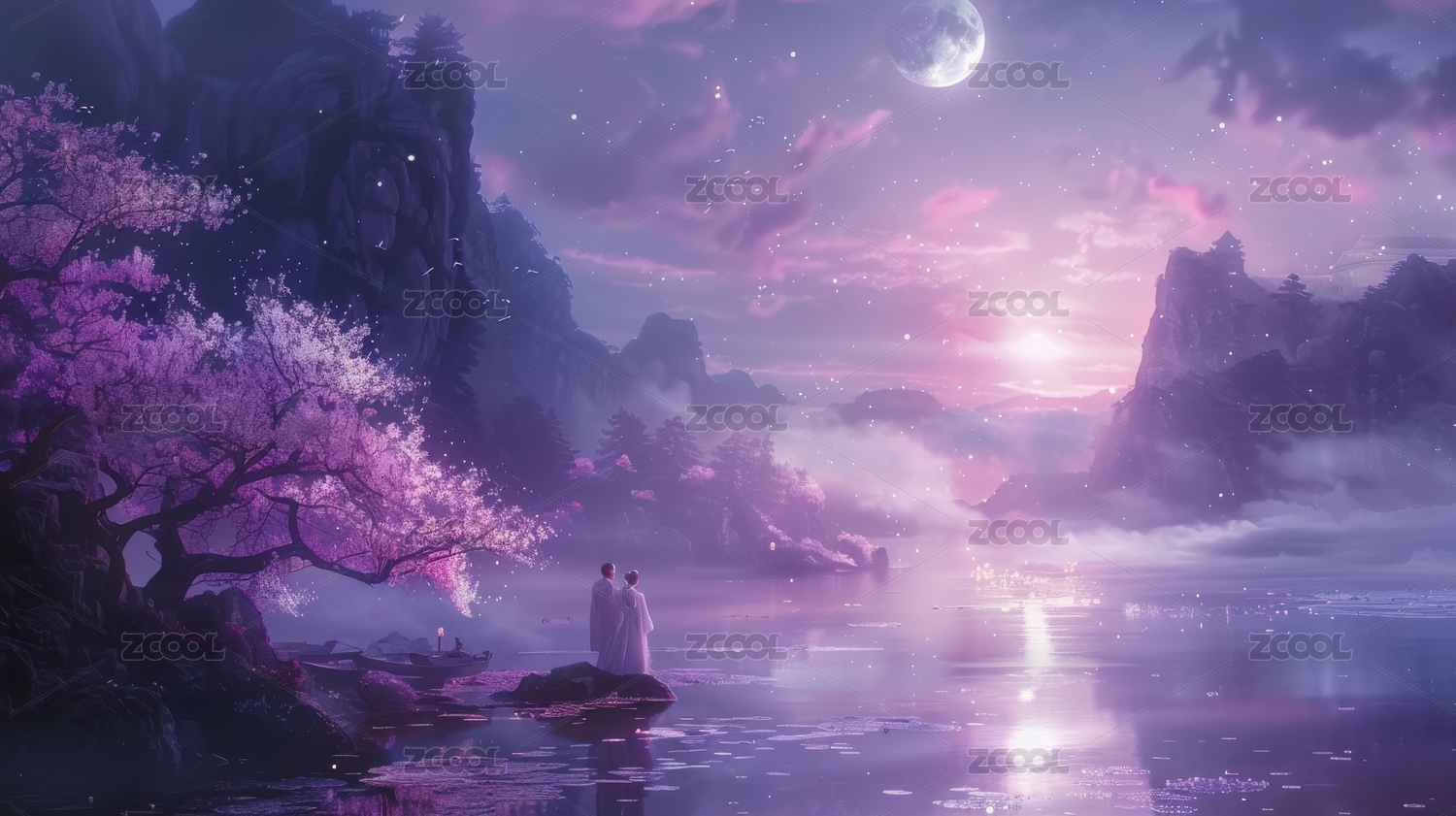 水墨,国画,国风,意境,山水画,夜晚,花,月亮,晴朗,春季
