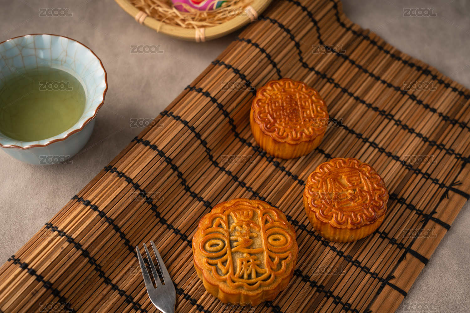 白底上摆放的月饼和青瓷茶壶茶杯