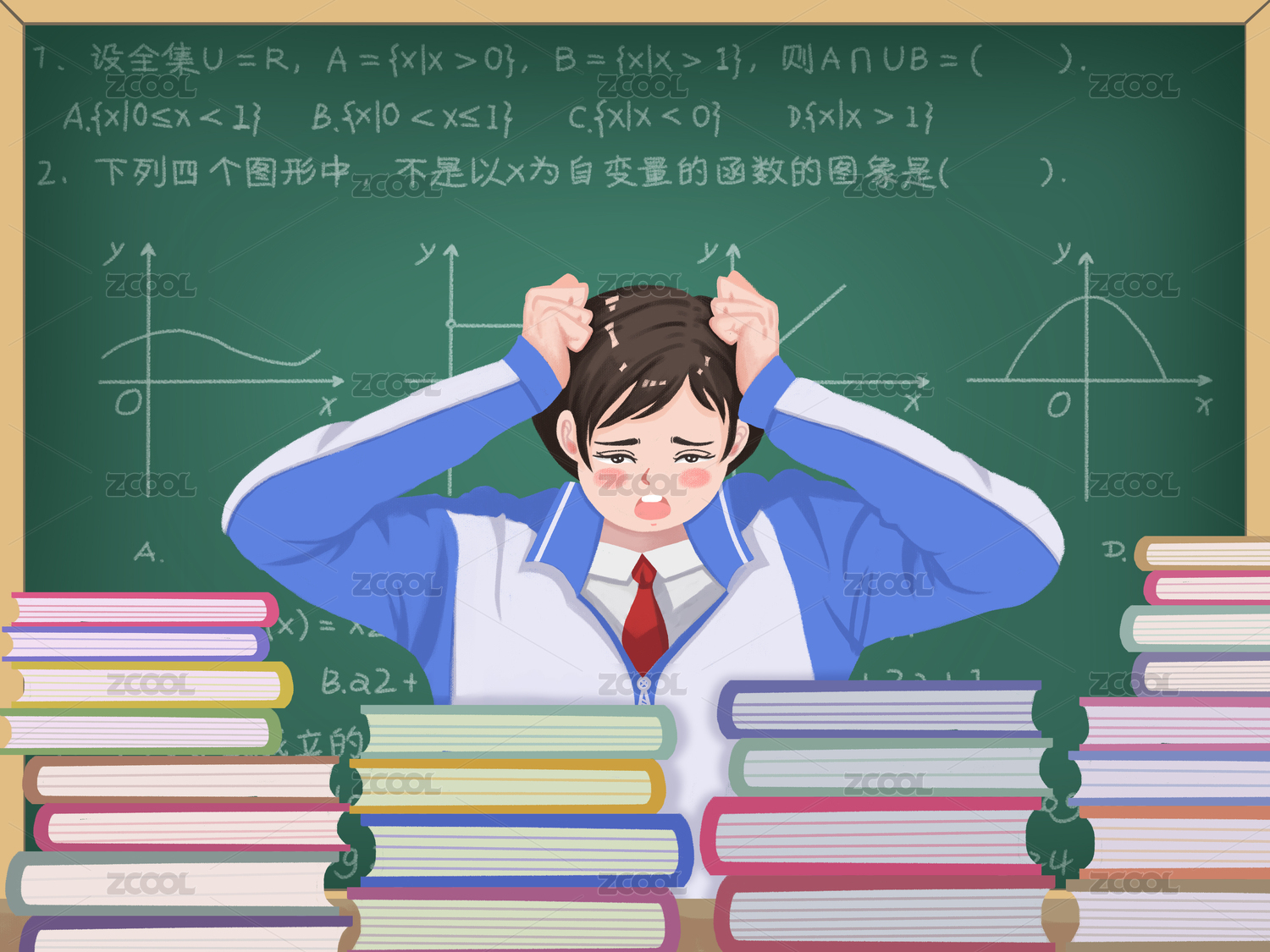 手绘插画 两位学生坐在书桌在写满公式的给办前举手加油