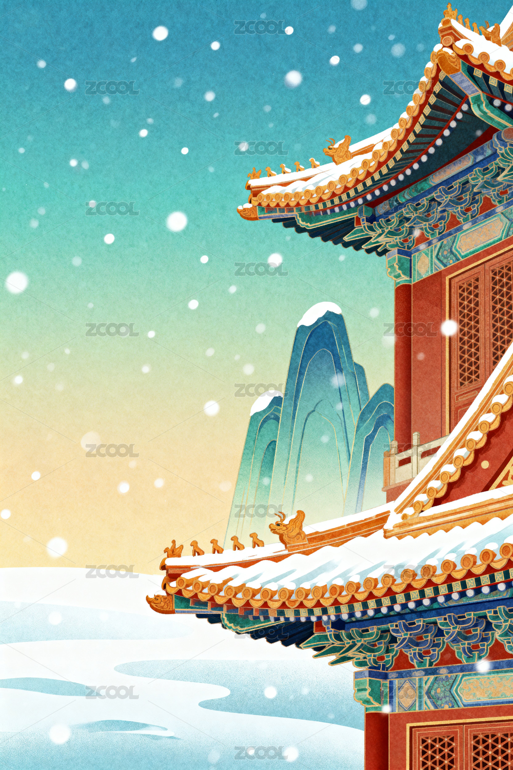 古风,下雪,建筑,冬天,雪景,冬季,雪花,节气,插画,立冬