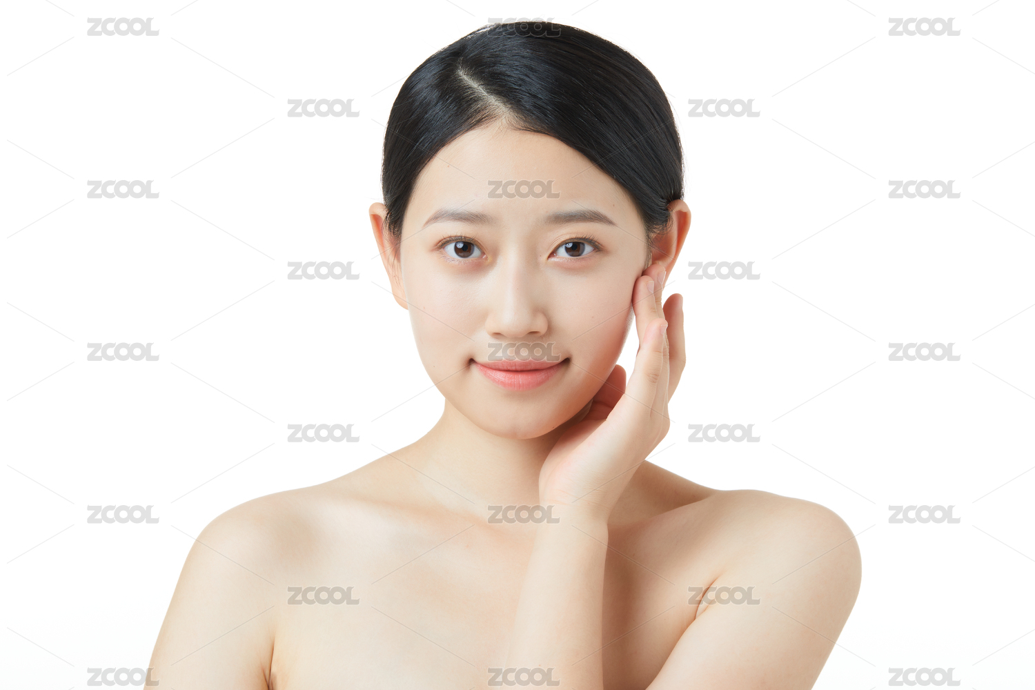 美丽的亚洲女子抚摸她的美人脸,在白色背景孤立