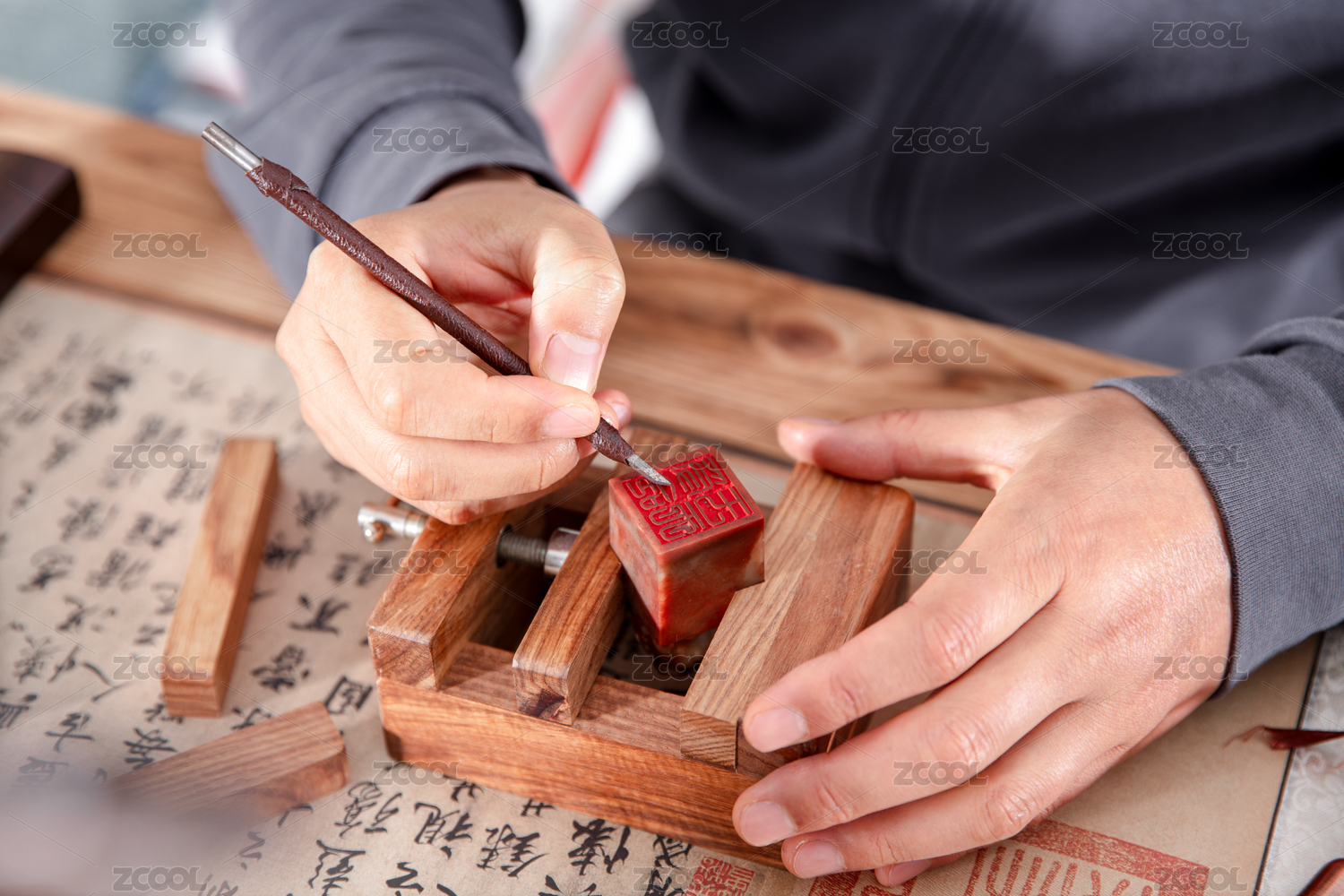 桌面上的毛笔宣纸砚台印章等文房四宝