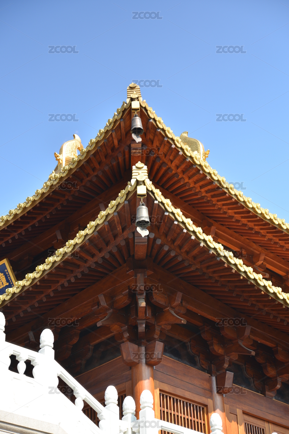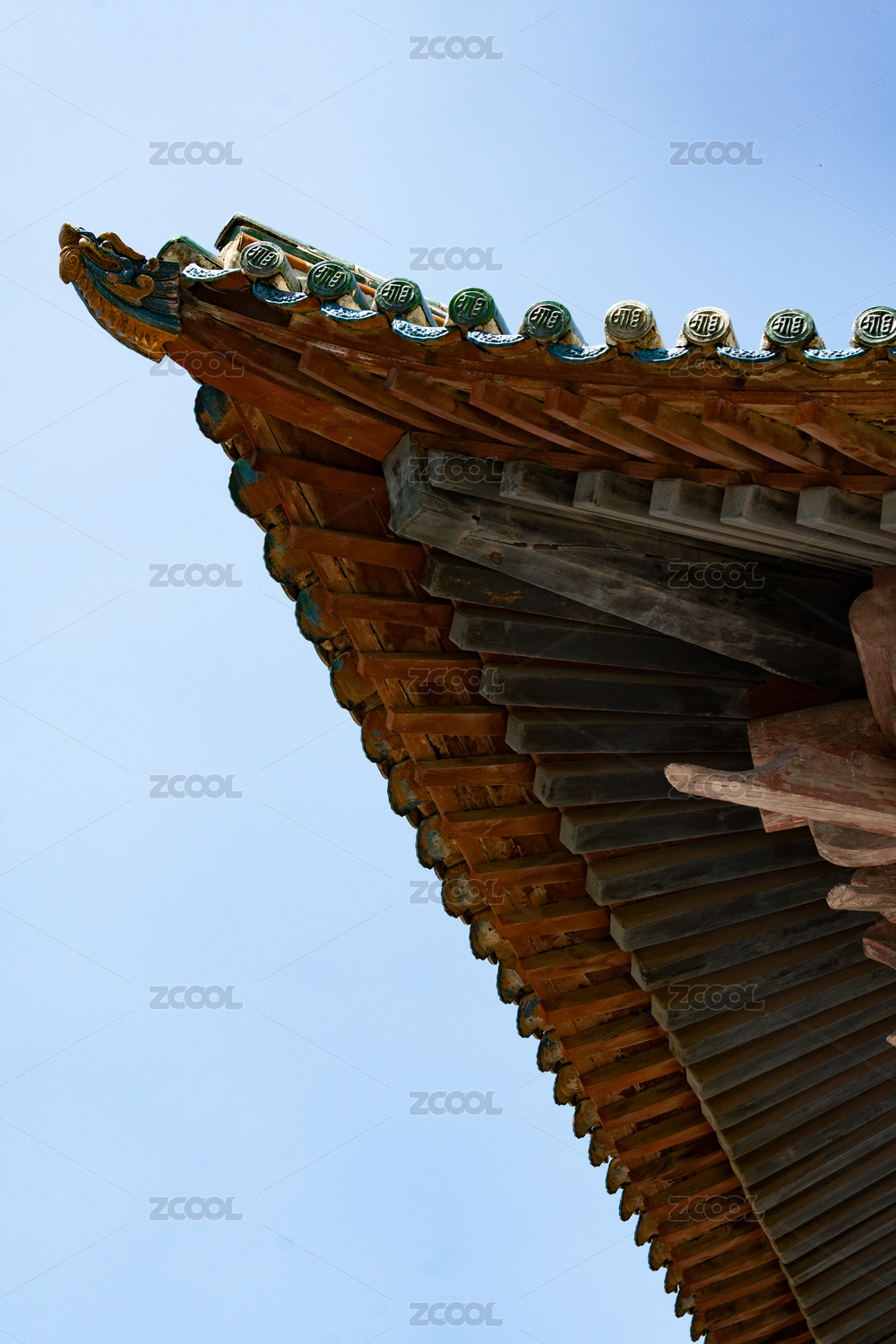 中国古寺庙建筑屋角飞檐琉璃瓦特写
