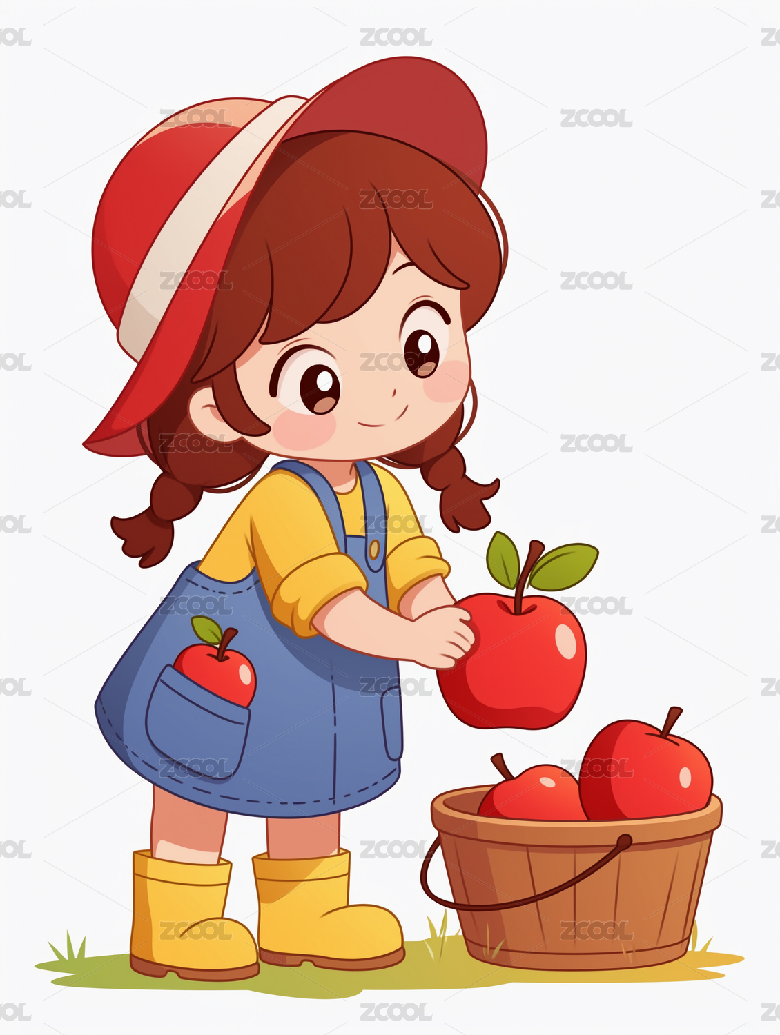 卡通秋季穿厚外套围围巾抱苹果可爱女孩插画