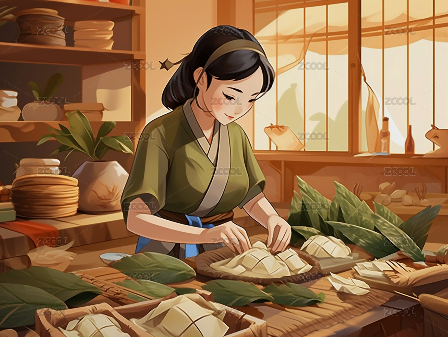 端午节,在厨房包粽子的女孩