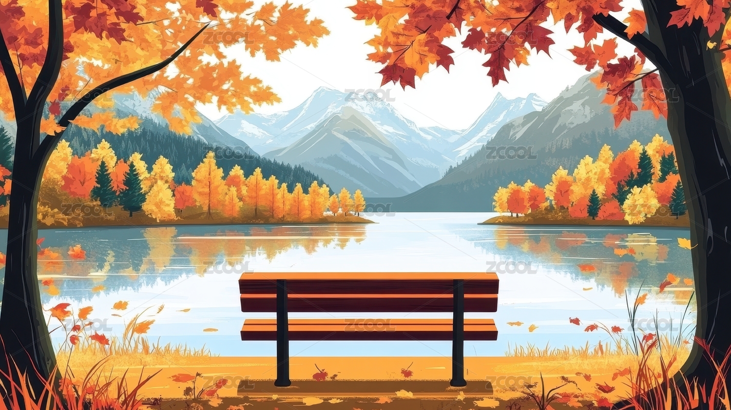 秋日湖畔长椅