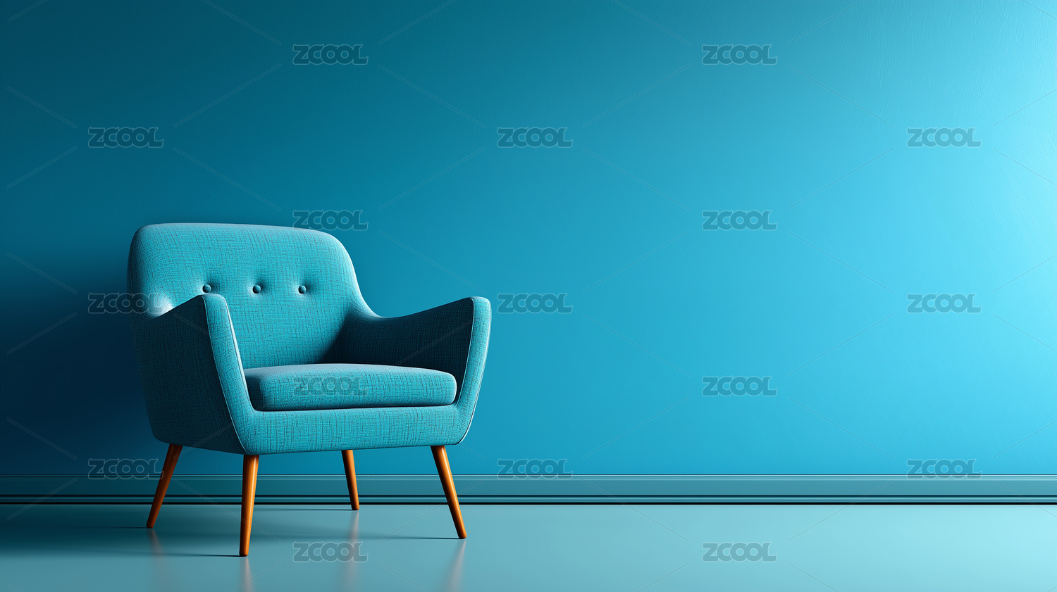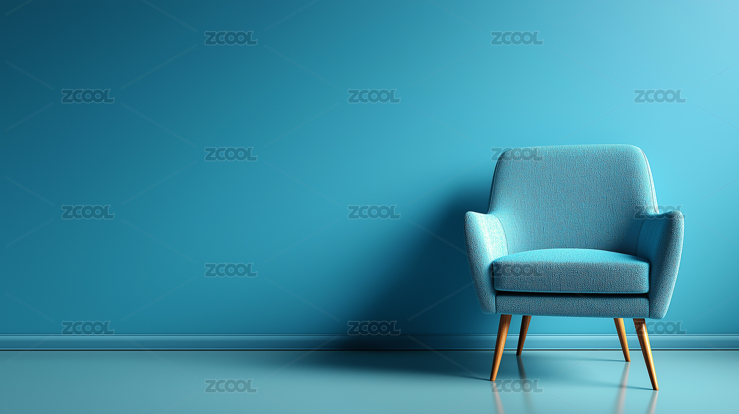 蓝墙浅蓝地面配右侧简约单人沙发椅
