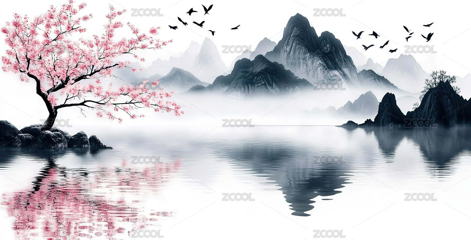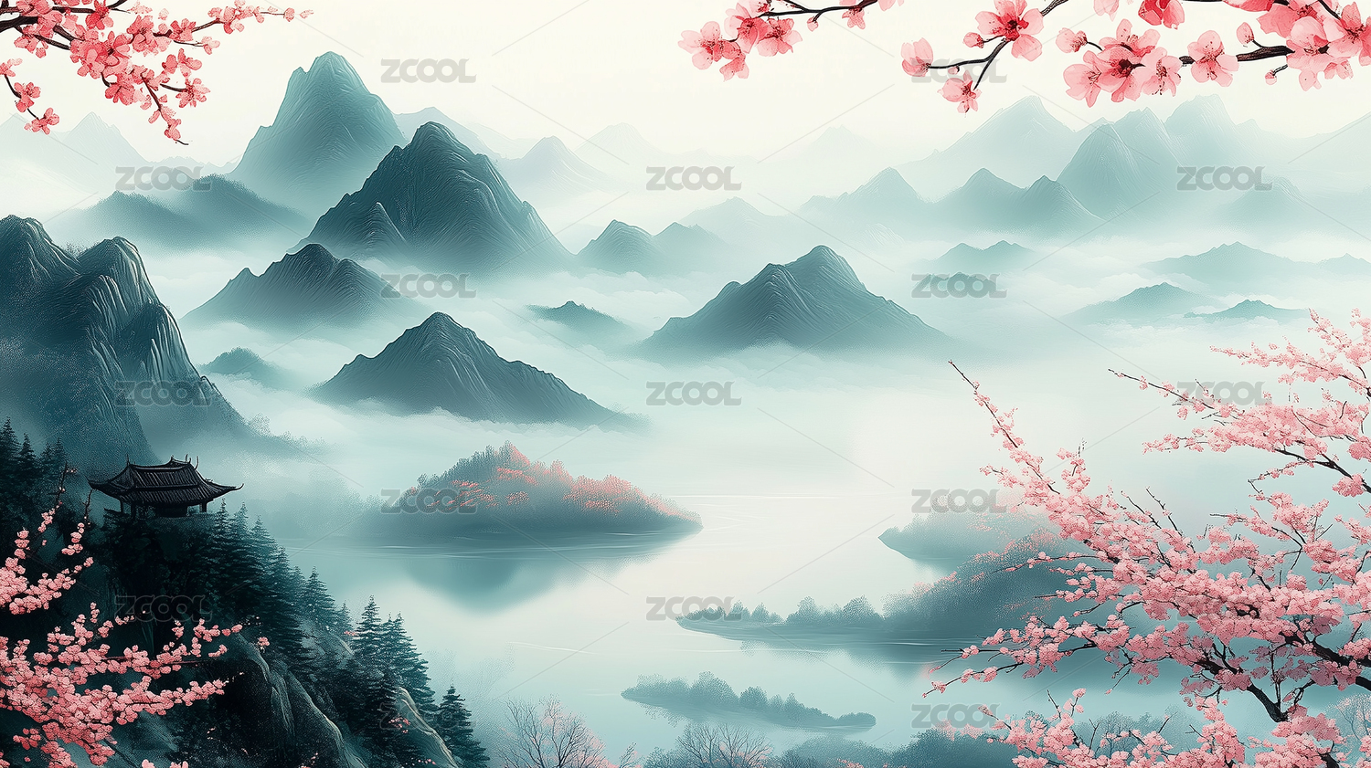 中国风,静谧,水墨画,中国画,宁静,山峰,寺庙,山水画,云雾,建筑