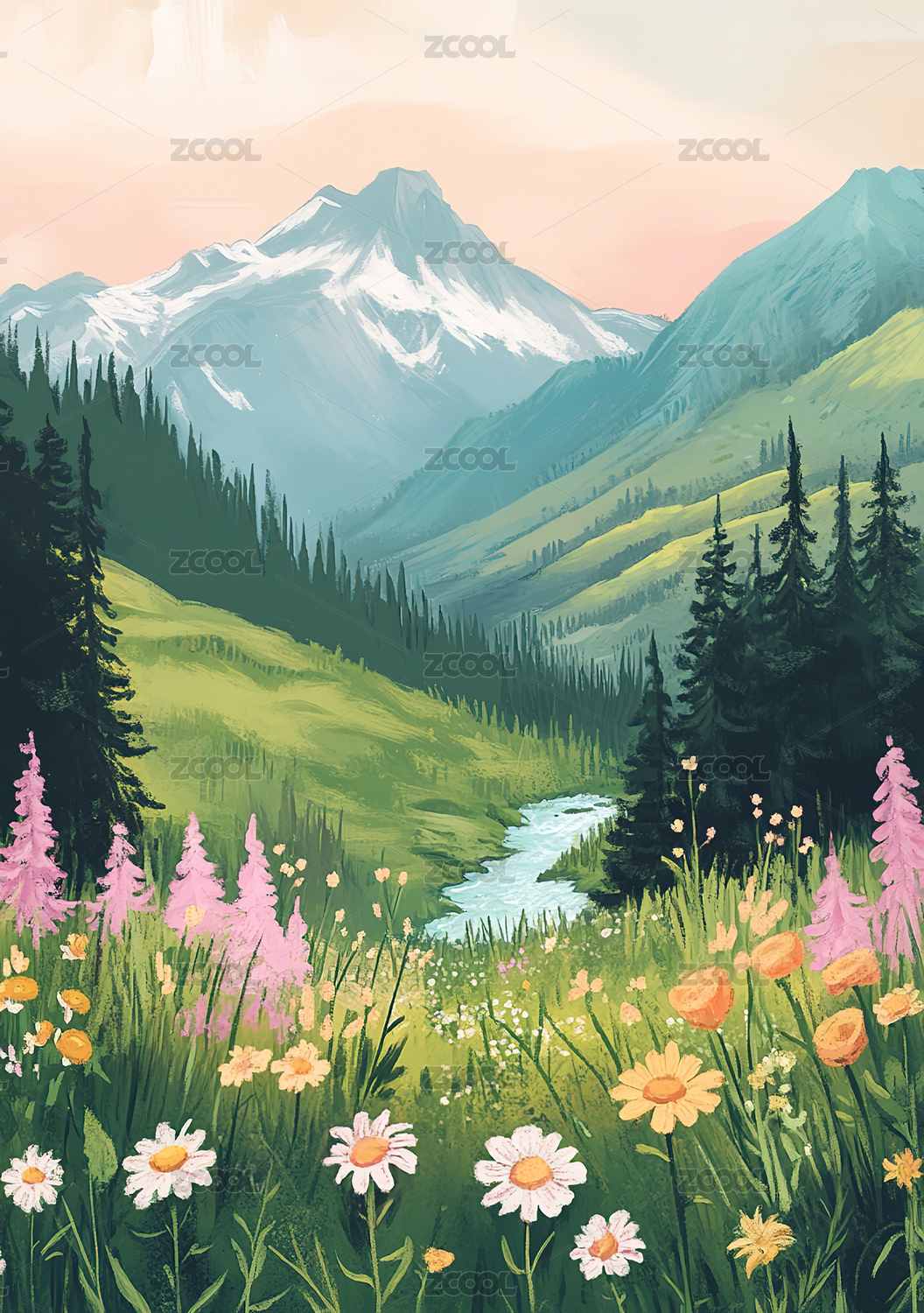 插画风格的鲜花田园山谷风光