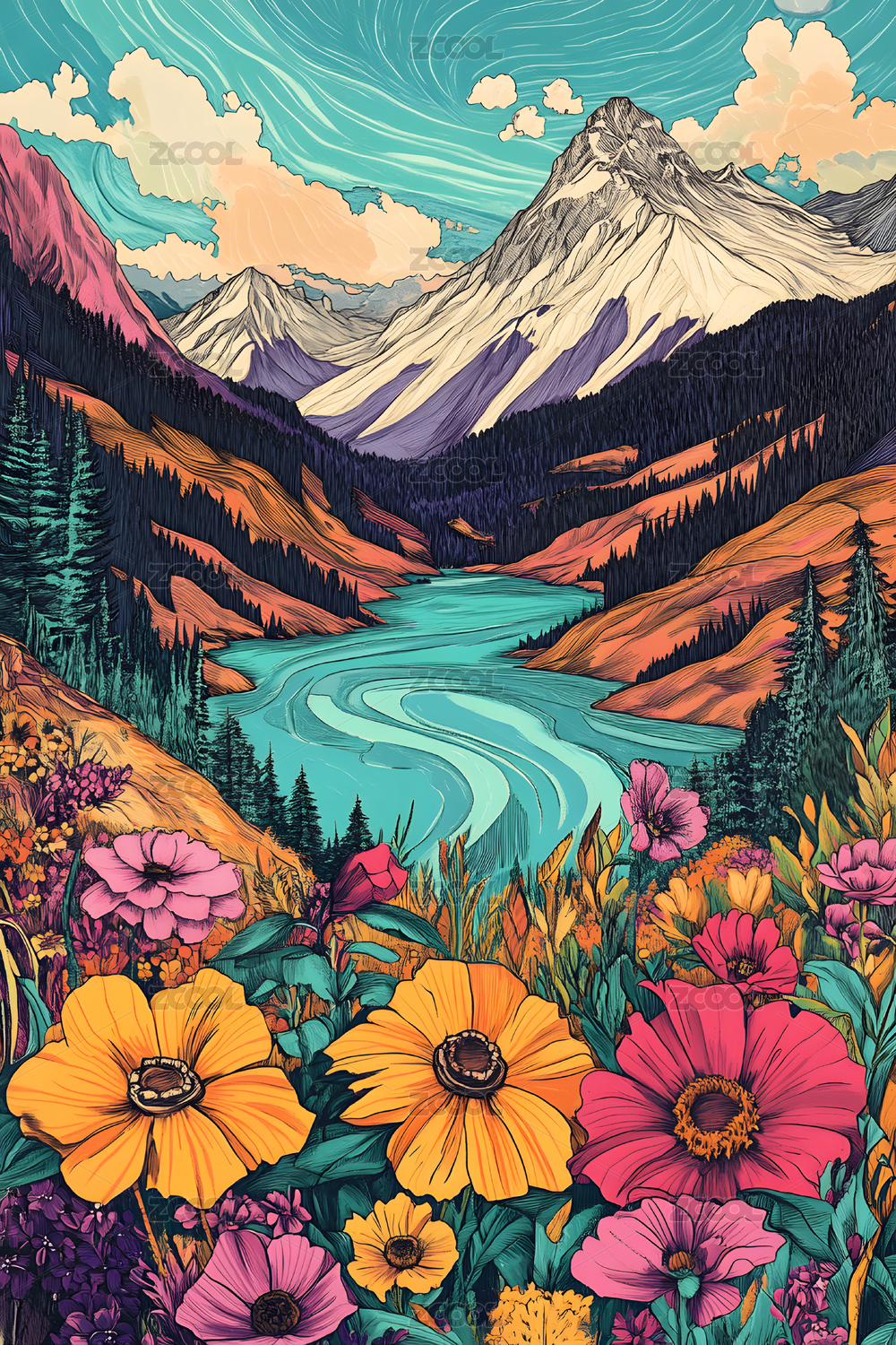 精美手绘山川河流自然风景插画