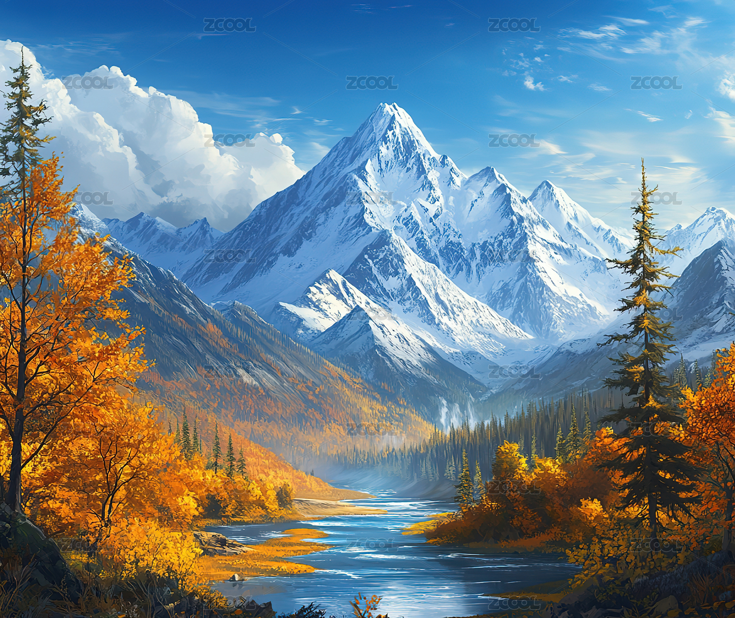 雪山溪流与松林