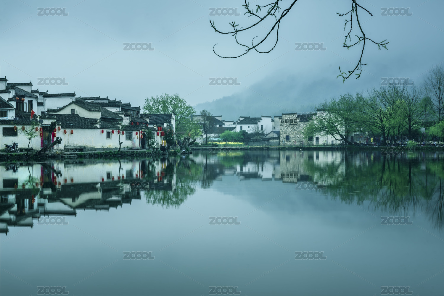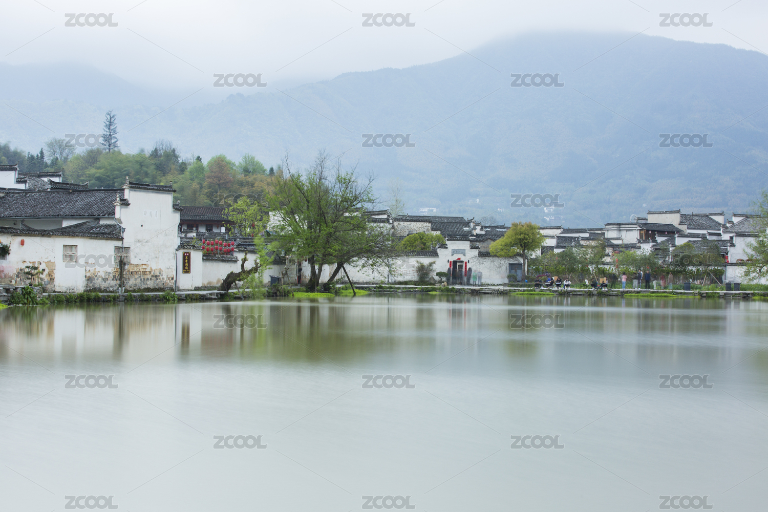 中国安徽省黄山市呈坎古镇烟雨中的景观