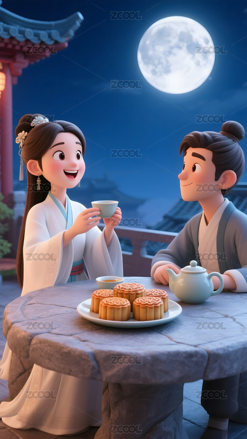 中秋节赏月吃月饼的汉服小孩3D卡通插画