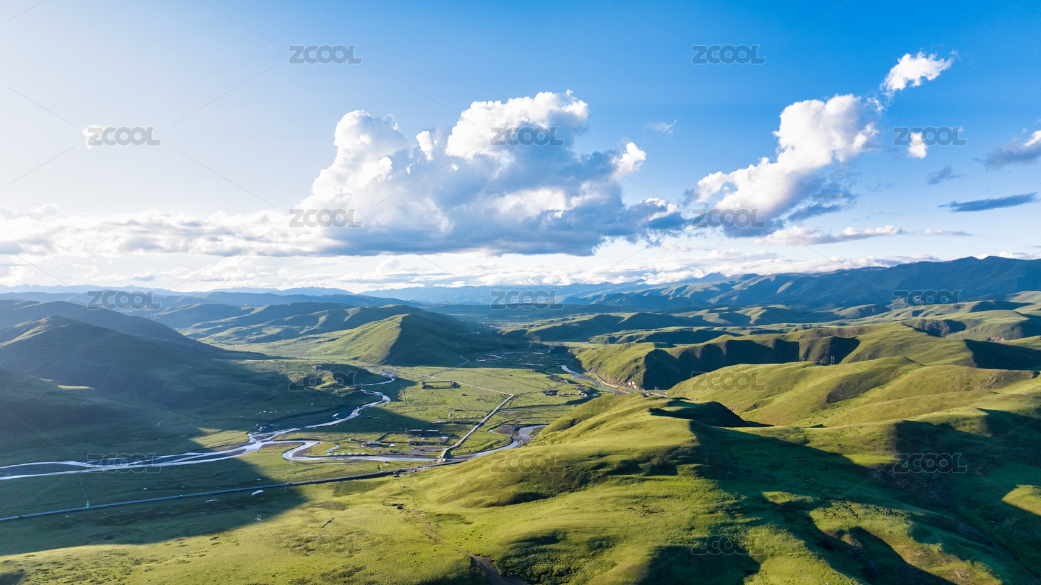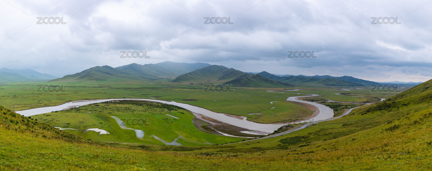 四川阿坝漫泽塘湿地绿色山丘草原河流全景图
