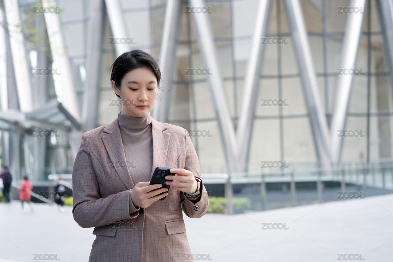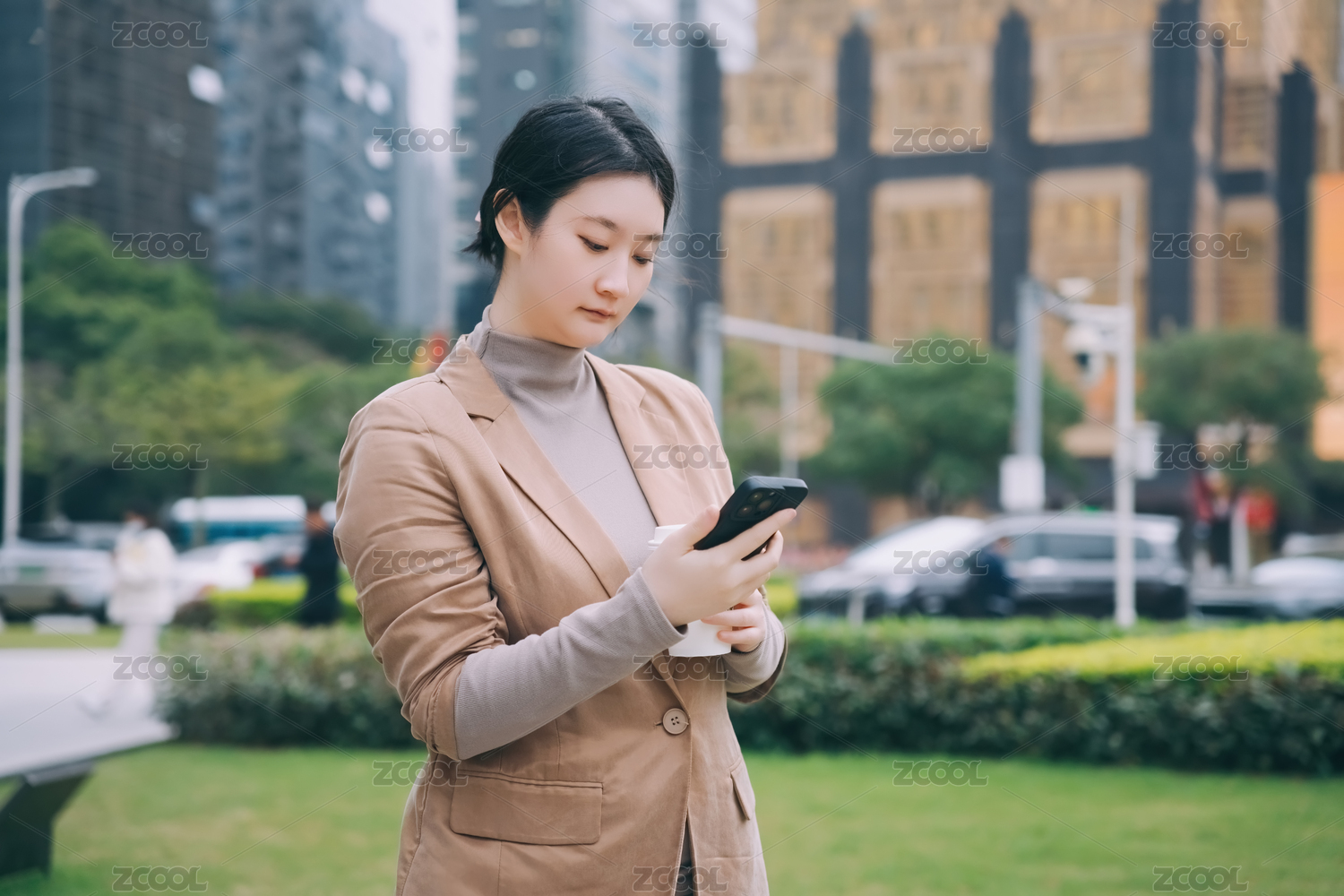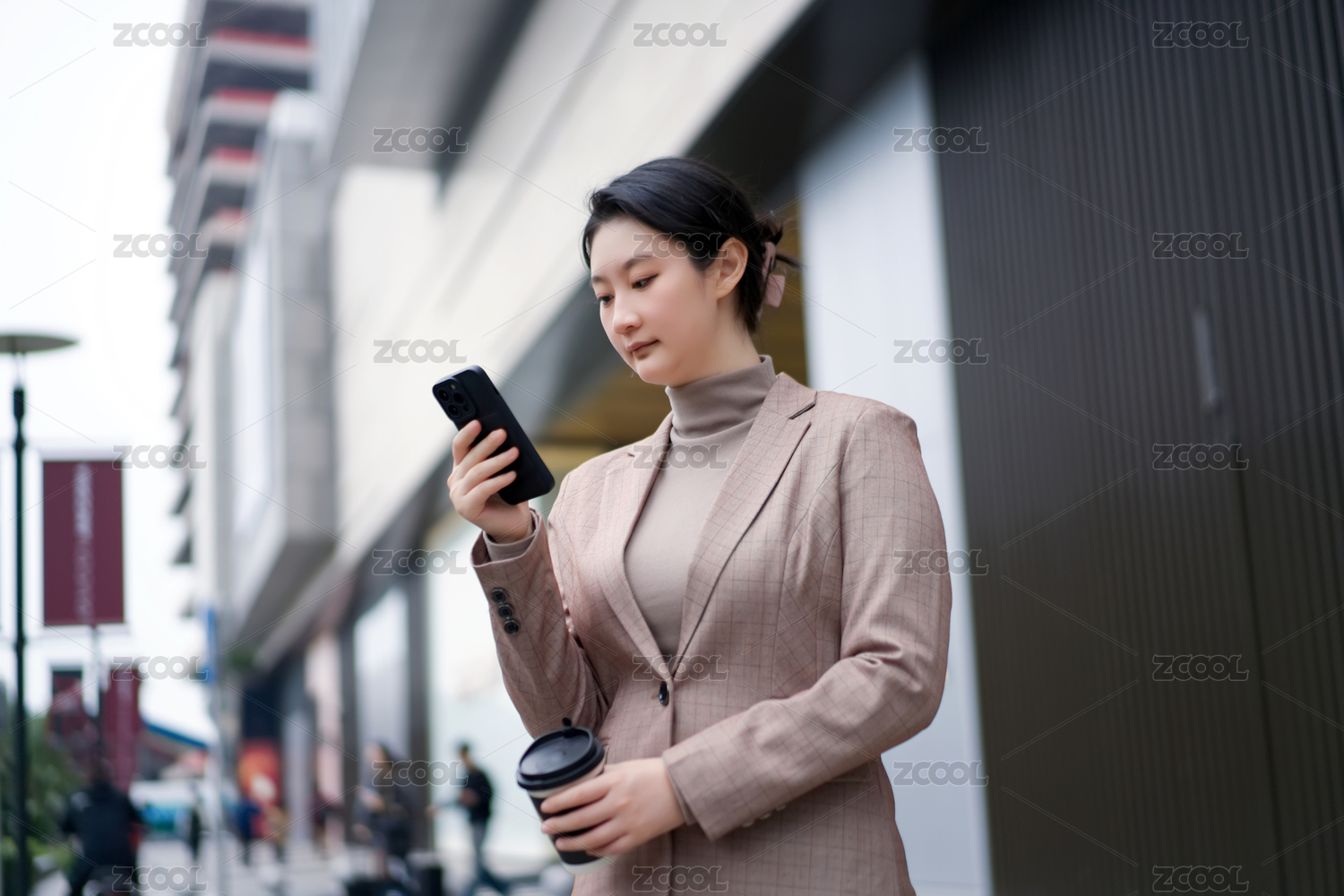 女商人,智能手机,咖啡休息时间,职业服装,户外,现代建筑背景,城市环境,企业生活方式,技术使用,职业导向
