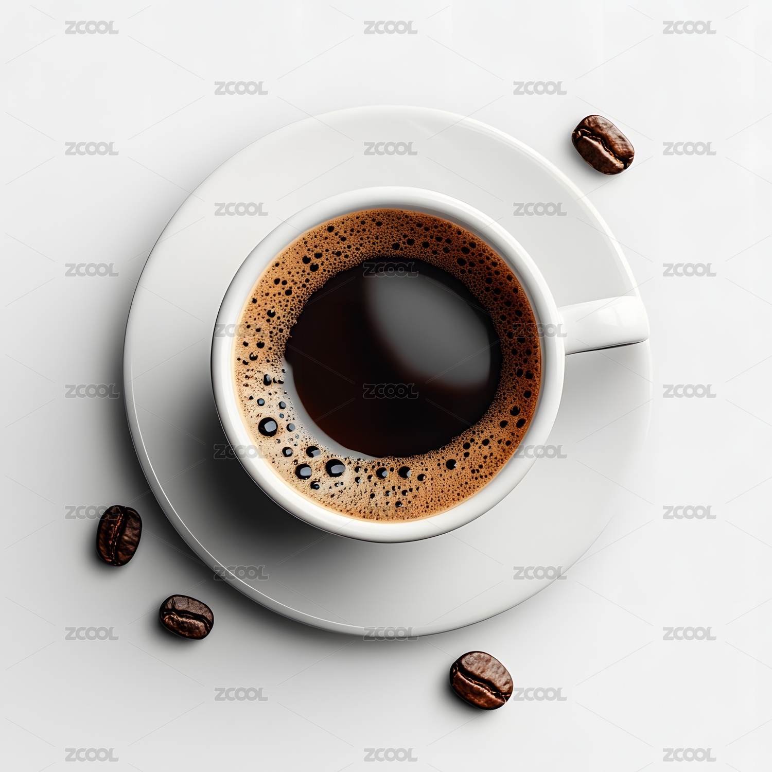 白色杯碟装黑咖啡配咖啡豆桌面特写