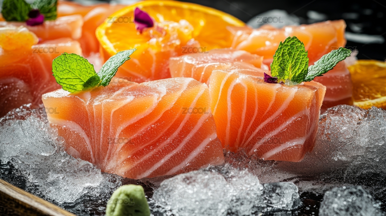 冰镇三文鱼片配橙片与薄荷
